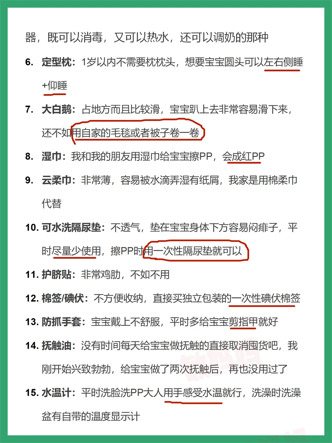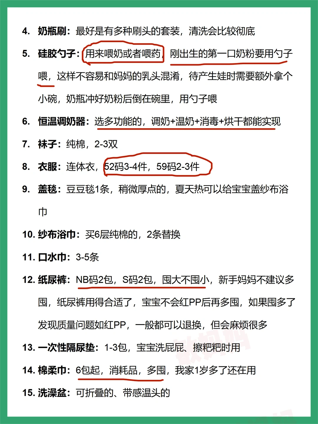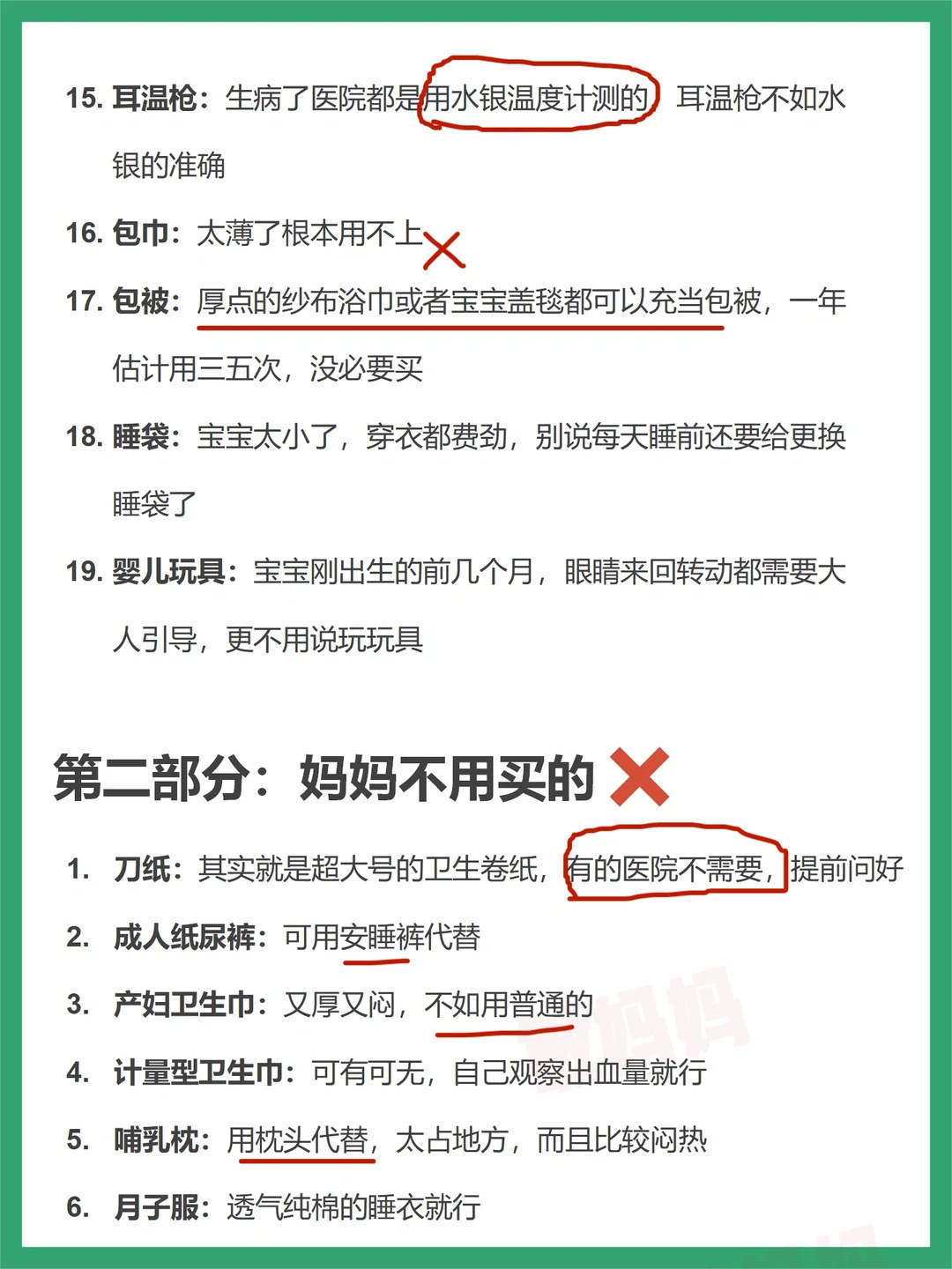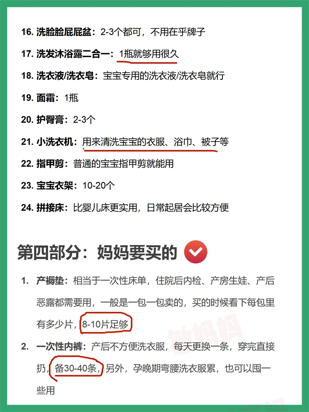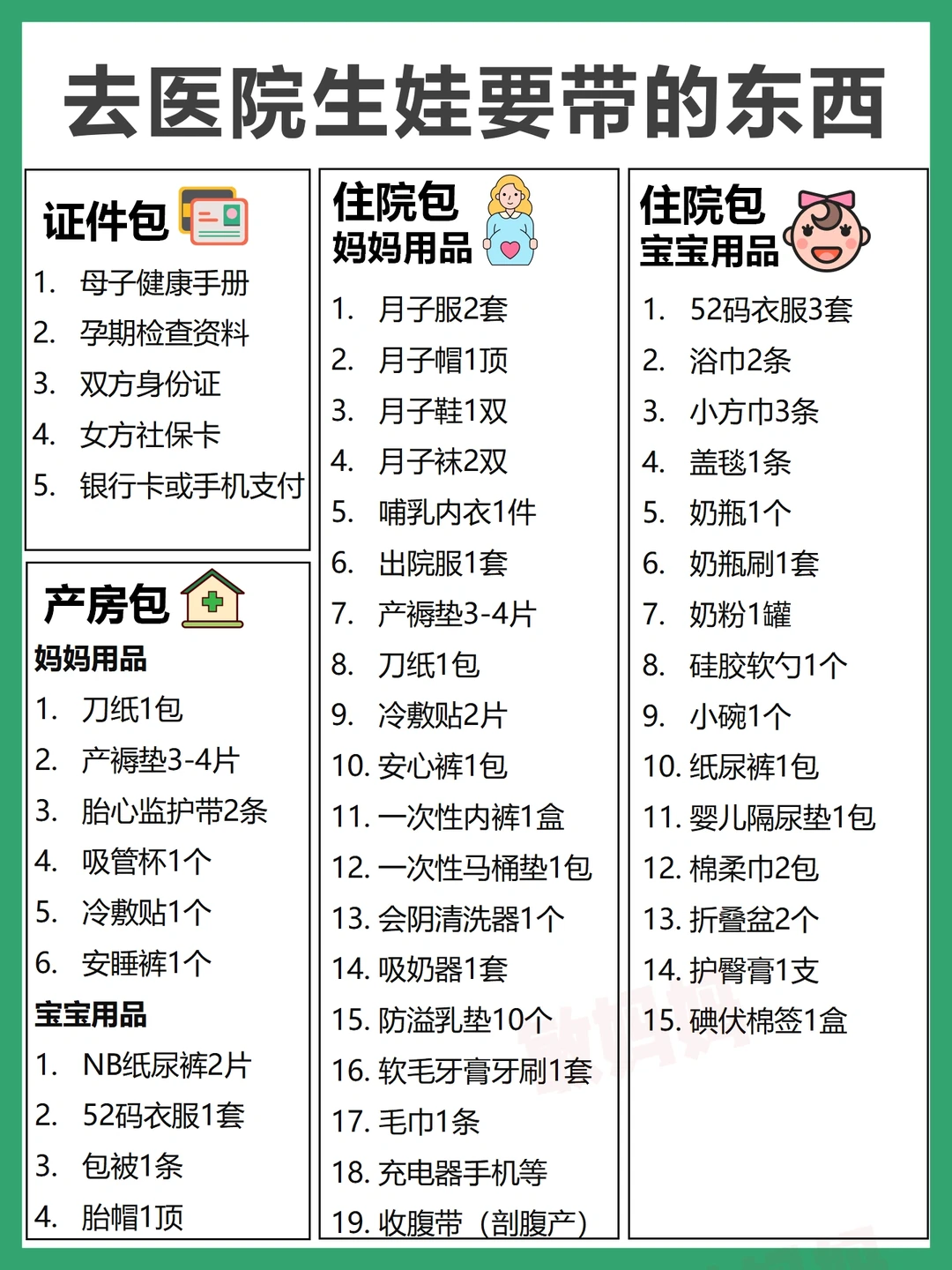 已生完宝宝1年,顺产,根据自己平时的护理经验整理了这篇文章,很多东西都是不需要买的,或者用了一两次就闲置了,可有可无,供参考~ 👉宝宝不用买的母婴用品-19件 👉妈妈不用买的母婴用品-12件 👉宝宝需要买的母婴用品-24件 👉妈妈需要买的母婴用品-9件 ✅去医院要拿的东西-证件包5件+产房包10件+住院包妈妈篇19件+住院包宝宝篇15件~ 预产期6月-10月的小孕妇们都可以准备了,需要的东西比较多,一件一件来~