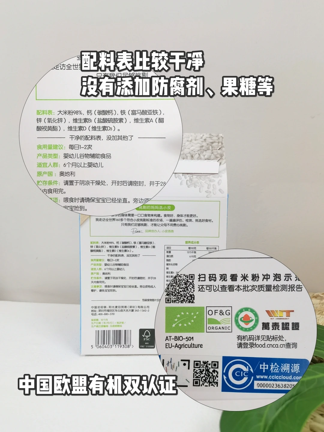 我家宝宝第一次吃米粉,就特别喜欢,冲开后能闻到淡淡米香味,粉质比较细腻,容易吸收。翻看包装,能看到小皮高铁米粉每100g中,二价铁含量高达5.8mg,基本上接近国标范围(4-6mg/100g)的峰值了👑,配料表也很干净,不添加植物油、果糖、防腐剂等,经过中欧双有机认证,妈妈们可以放心入~