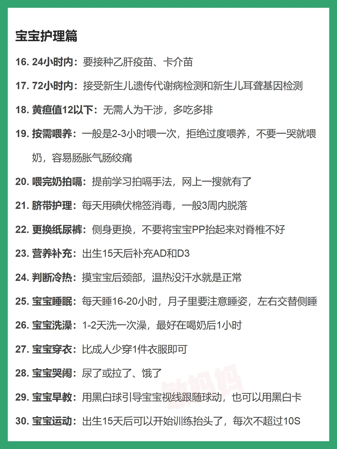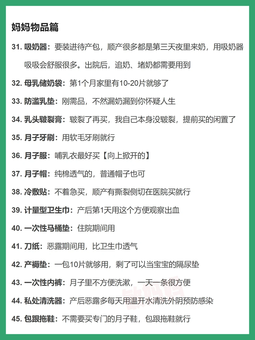 宝宝出生后,和很多新手爸妈一样,我那会也是手忙脚乱,其实归根原因在于自己没有提前做好宝宝护理的功课,所以准妈妈们,孕期就需要学习相关知识了~ 本篇重点 ✅宝宝物品篇 ✅宝宝护理篇 ✅妈妈物品篇 ✅妈妈护理篇 ✅母乳喂养与母乳瓶喂 . 持续输出育儿知识 下一篇《新生儿第2个月,一胎妈妈不知道的40件事》