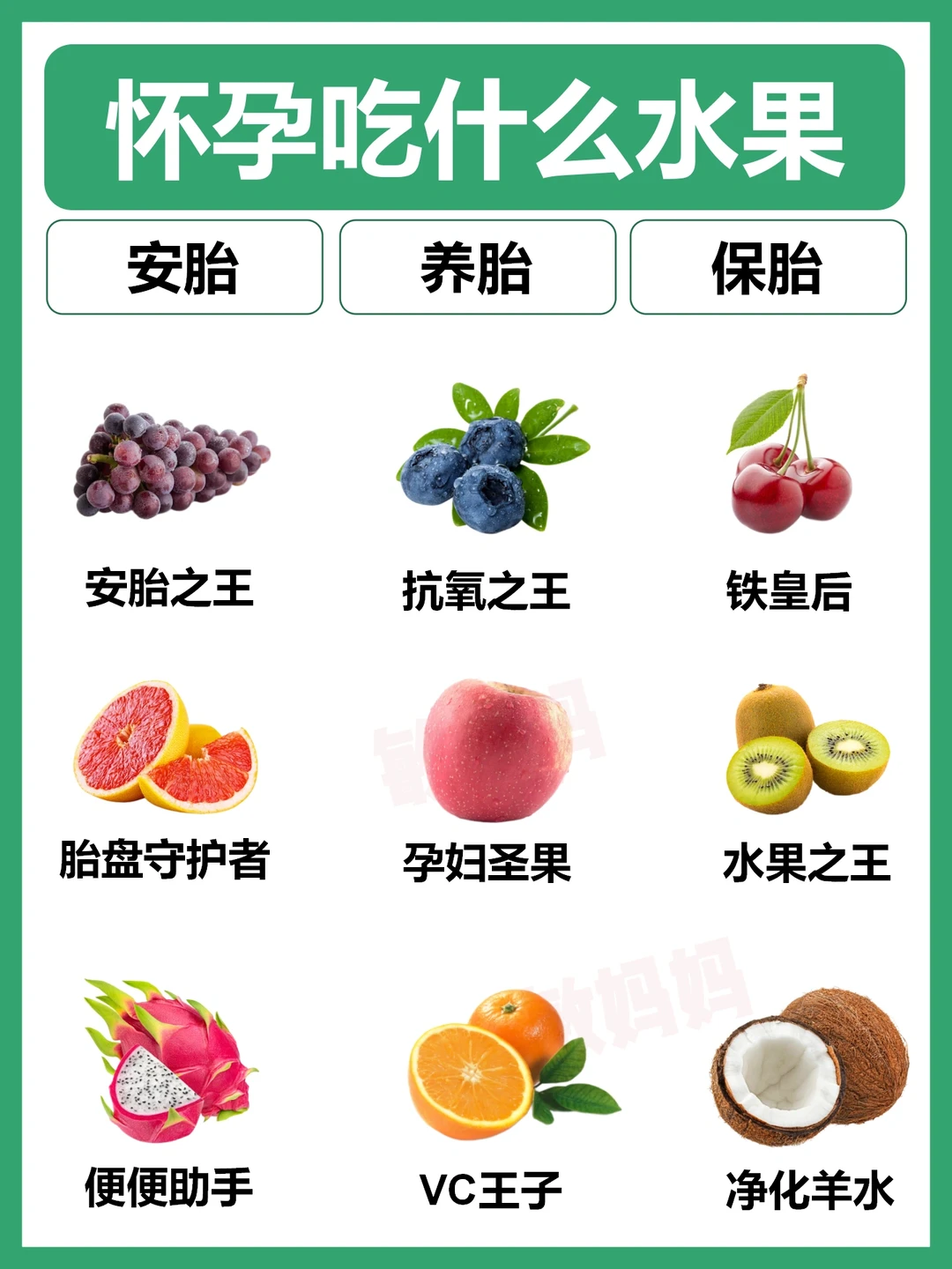 1⃣️安胎之王——葡萄 2⃣️抗氧之王——蓝莓 3⃣️铁皇后——樱桃 4⃣️胎盘守护者——西柚 5⃣️孕妇圣果——苹果 6⃣️水果之王——猕猴桃 7⃣️便便助手——火龙果 8⃣️VC王子——橙子 9⃣️净化羊水——椰子水