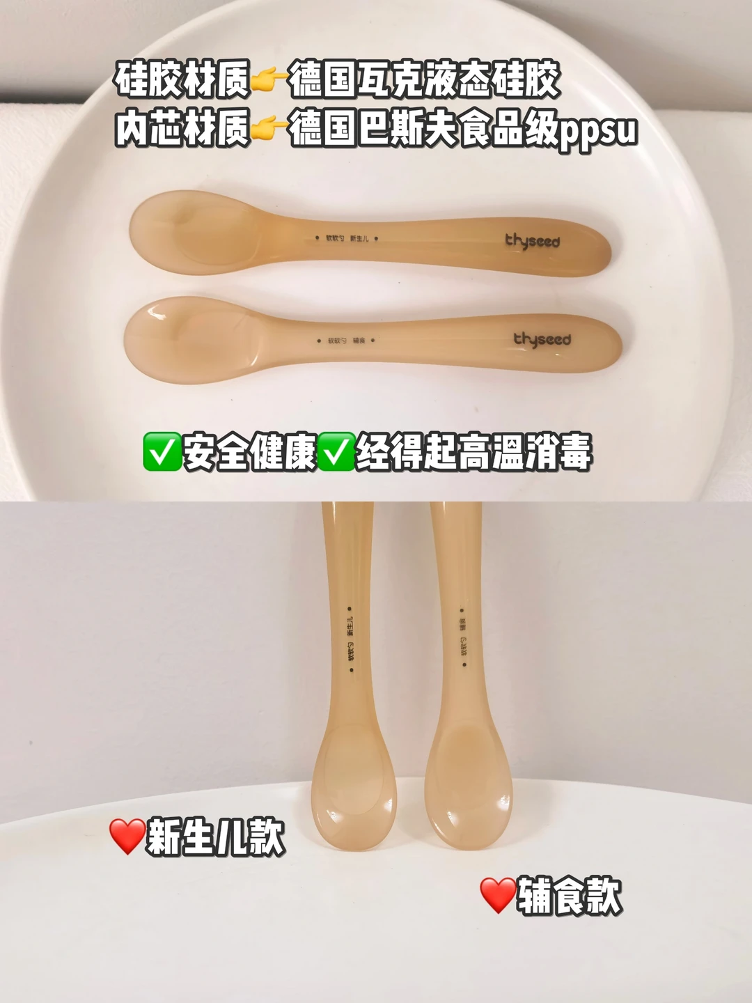 我家用的世喜这套硅胶还是套盒装的,除了新生儿软勺外还有一把辅食勺🥄,6个月开始用它来喂辅食超级方便实用。它是70°硅胶,材质很安全有韧性,宝宝4个月时候我就用它来挖果泥,舀食物也方便~