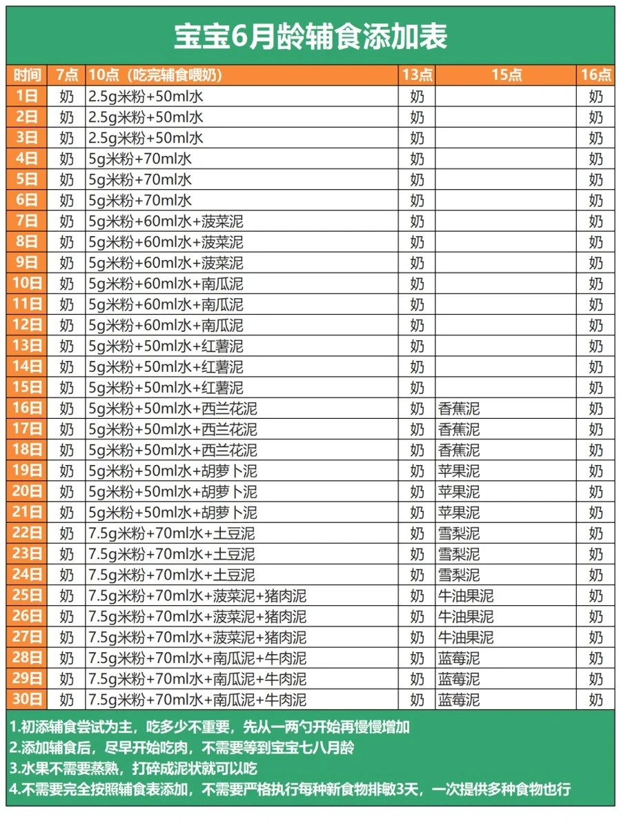 ‼️辅食更多攻略都放在图里了,篇幅有限只放了6月龄辅食添加表,想要6-12月龄的可留言~