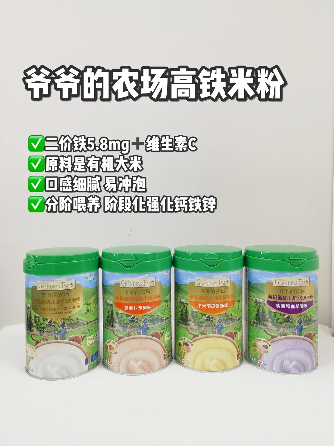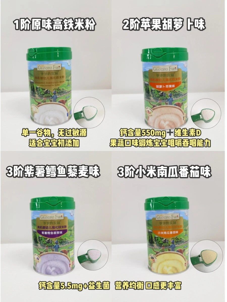 做了很多攻略,我选了爷爷的农场米粉,它的原料是有机大米,口感细腻比较好冲泡,更重要的是,爷爷的农场米粉含有二价铁搭配维生素C,铁含量高达5.8mg/100mg,可以满足宝宝的铁元素需求❤️包装都是密封罐装,更易储存