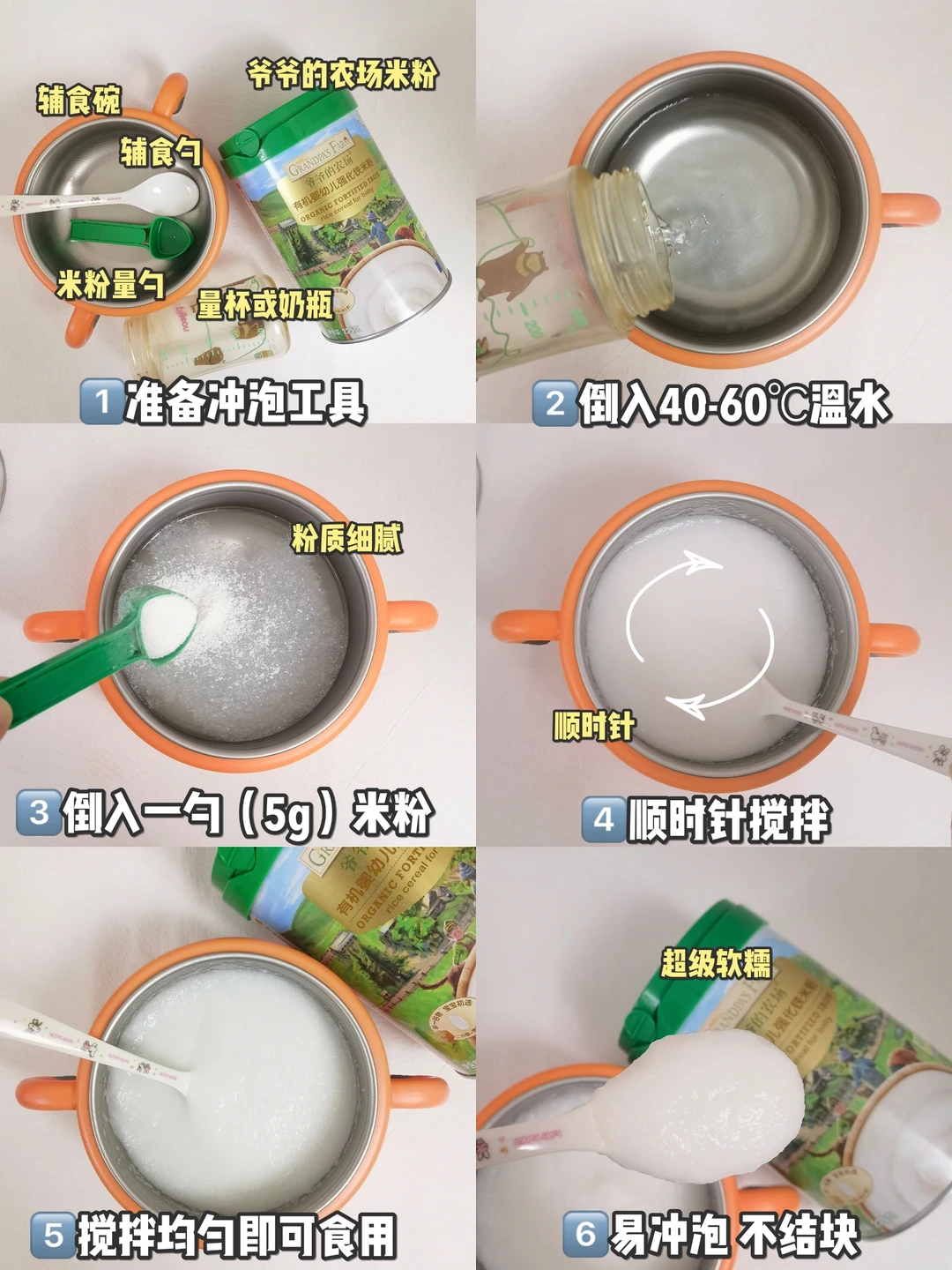 🌟冲调方法:40-60度左右的温水倒入辅食碗,加入一勺米粉,静置30秒后顺时针搅拌均匀即可