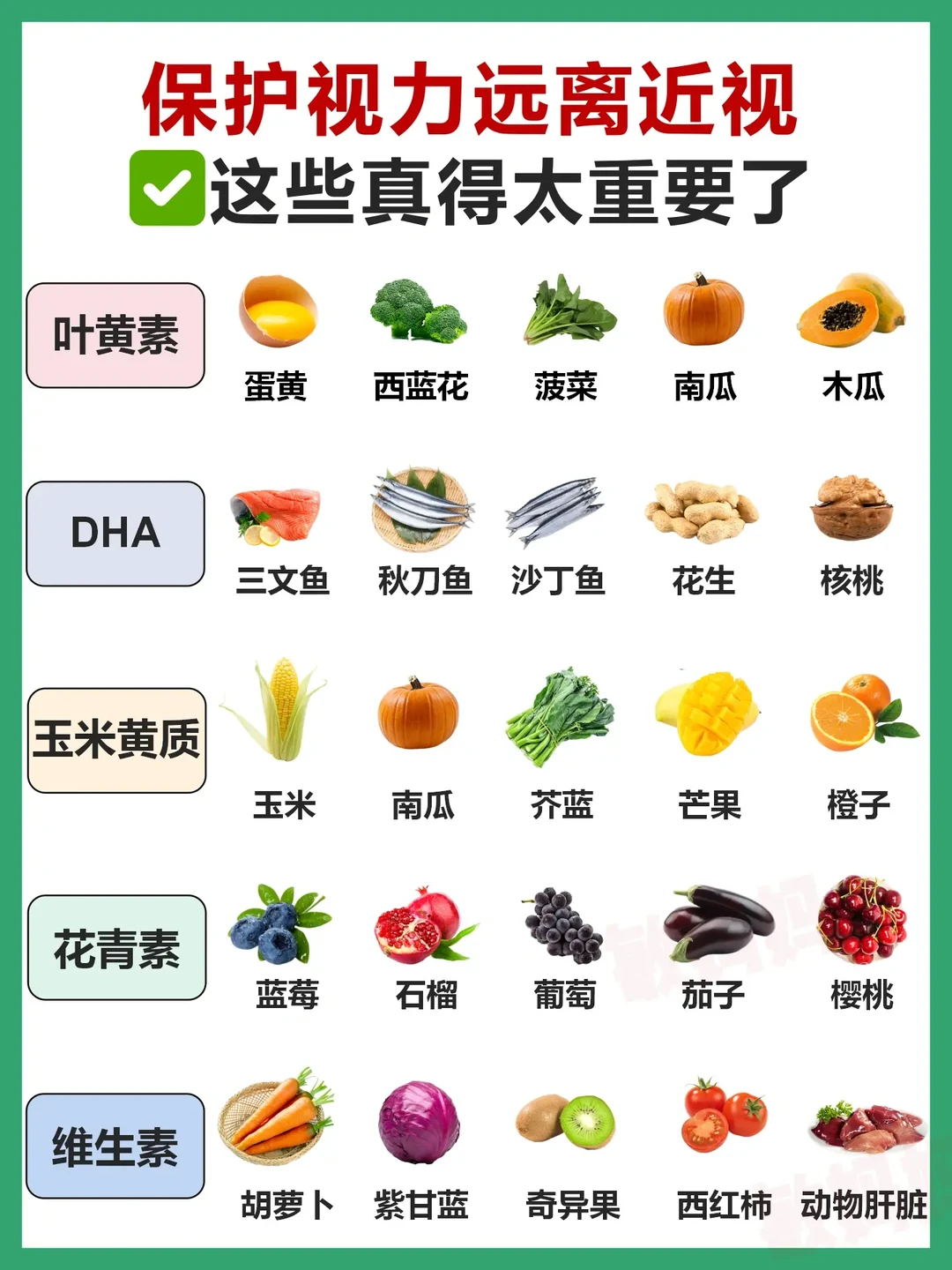 日常饮食中,多让孩子吃富含叶黄素、DHA、玉米黄质、花青素、维生素等对眼睛好的食物🌱