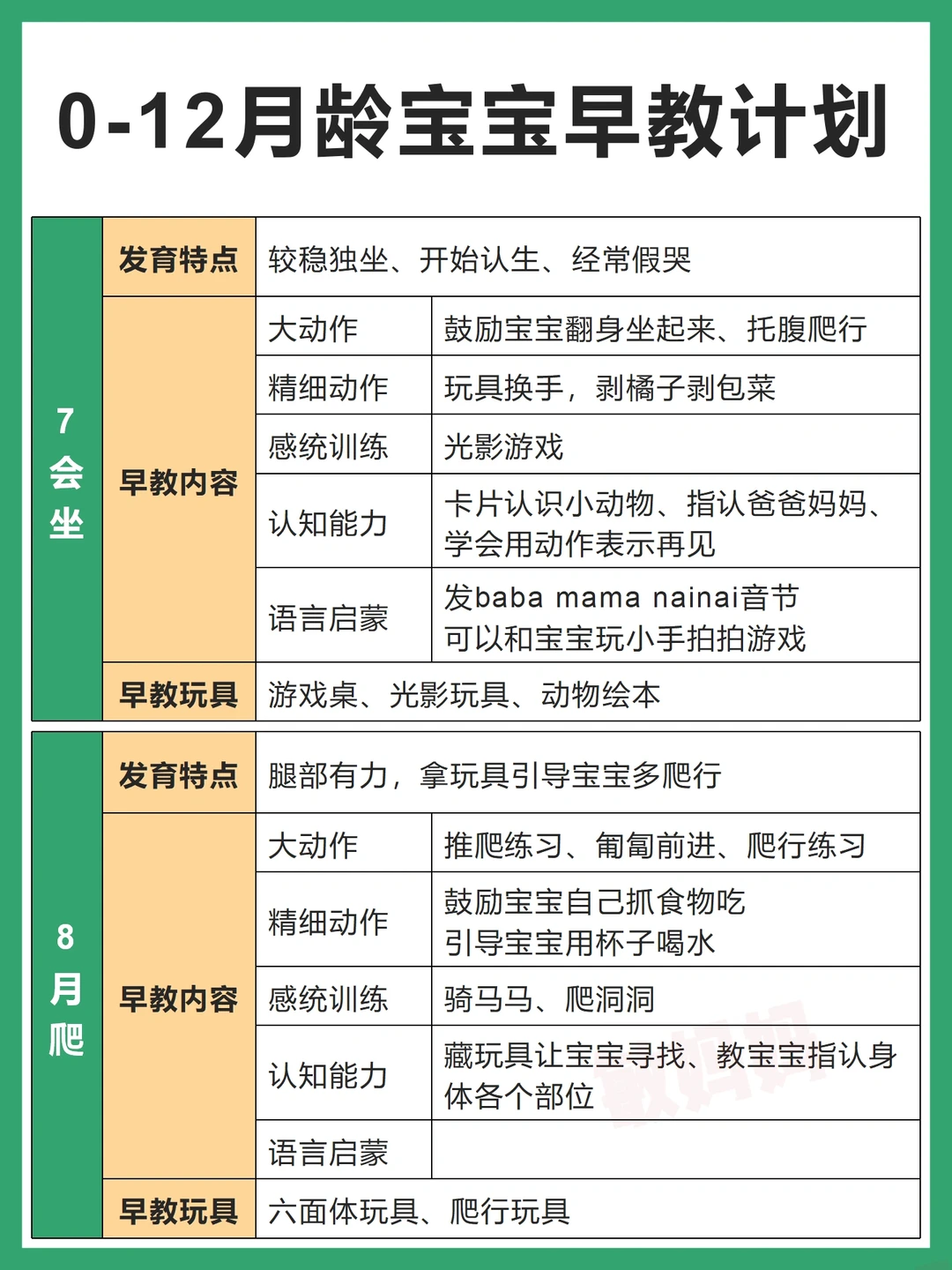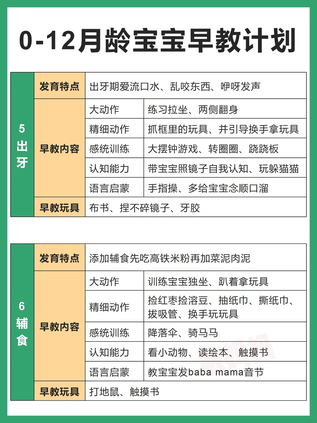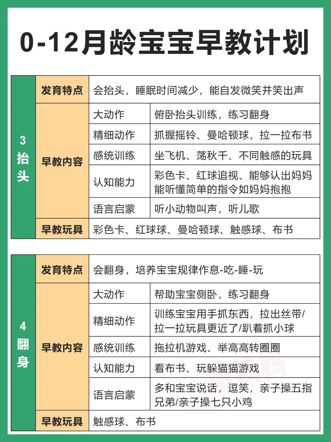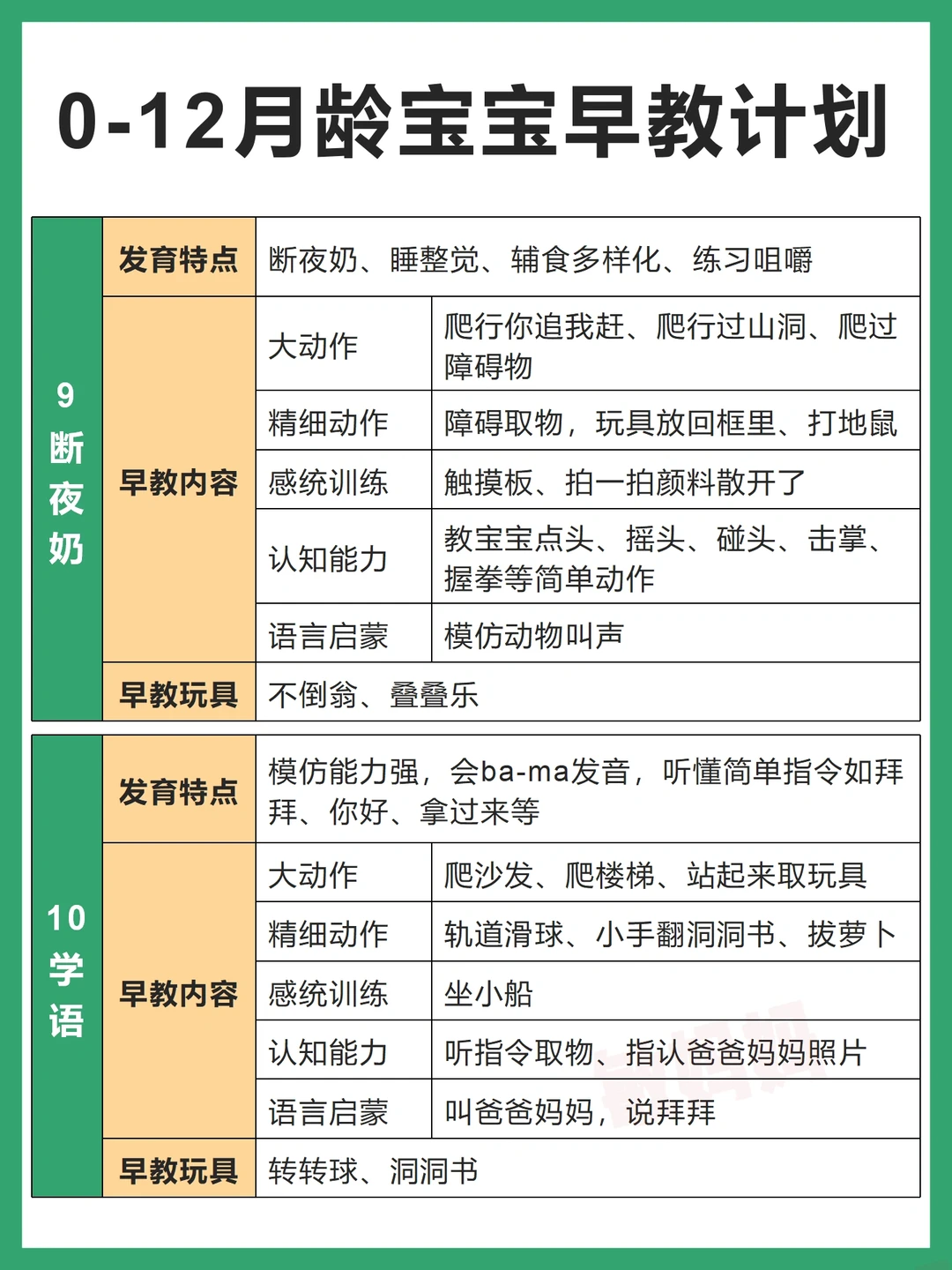 👉1月睡、2月闹、3抬头、4翻身、5出牙、6辅食、7会坐、8月爬、9断夜奶、10学语、11会站、12学走⭐
