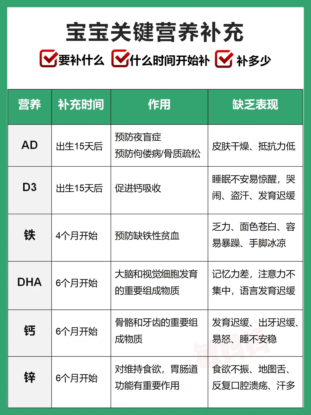 👉日常保证奶量,4月龄血红蛋白低于正常值时补充,6月龄后可通过食物补充
