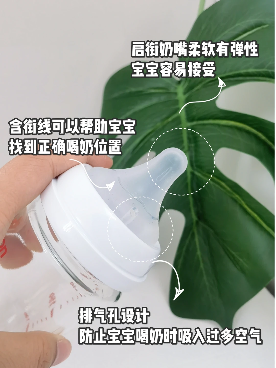 2⃣️选择奶嘴接受度高、奶嘴型号多的奶瓶。奶嘴不合适,宝宝容易吸入多余空气,导致呛奶漏奶。奶嘴软硬不合适,宝宝会排斥奶嘴或产生R头混淆。