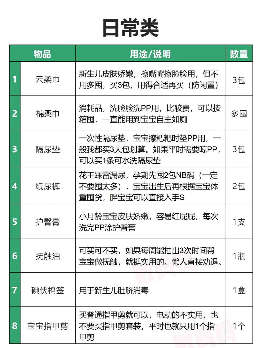 👉云柔巾、棉柔巾、隔尿垫、纸尿裤、护臀膏、抚触油、碘伏棉签、宝宝指甲剪