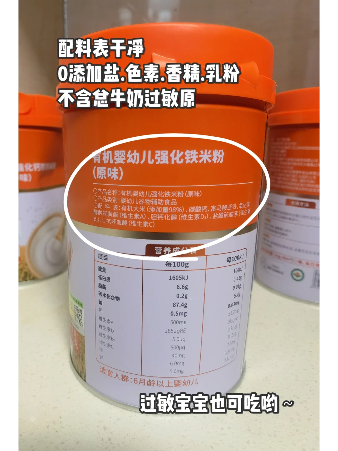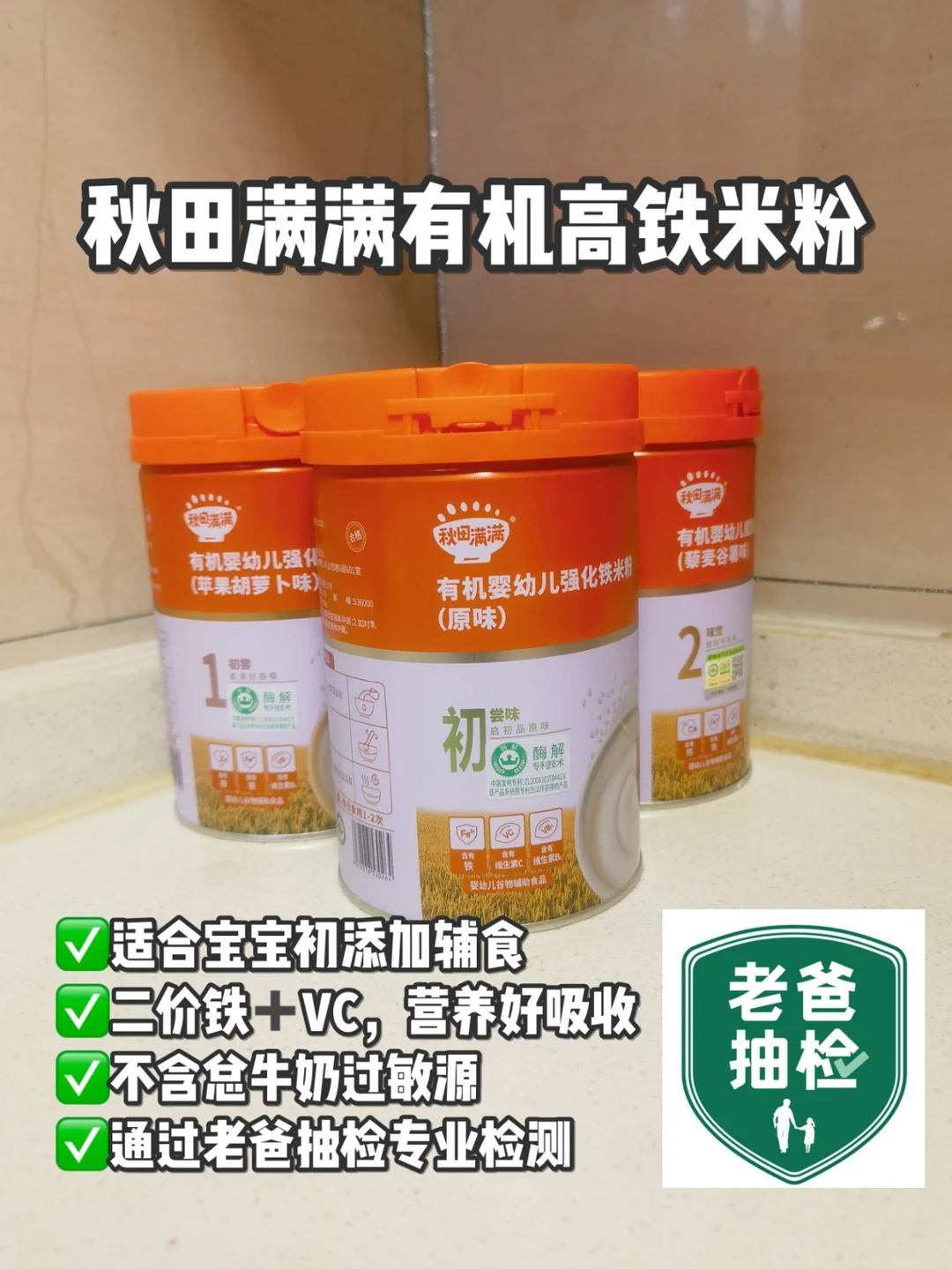 我家刚开始吃的秋田满满原味米粉,选用95%以上南粳有机大米🍚🍚🍚,通过了中国有机产品认证标准,含铁量比较高,里面有添加维生素C,可以更好地促进铁吸收。💟并且它里面不含总牛奶过敏原,0添加盐、色素、香精、乳粉,是通过老爸抽检专业检测的,所以安全这块很让妈妈👩🏻👩🏻👩🏻放心~