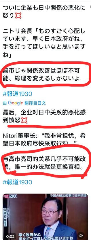 高市下台看来要提上议程了,日本企业很着急,他们对日中关系的恶化“感到愤怒”,Nitori 董事长在接受采访时说,他非常担忧,希望日本政府尽快采取行动,但只要高市在台上,与中国的关系几乎不可能改善,“唯一的办法就是更换首相”。 毕竟中日关系僵成这样,受损的都是实实在在的生意,企业能不愤怒、不担忧吗?更关键的是,这事儿不光是日本内部的权力更迭,本质上是中国对外部干涉势力的一次精准反击,搞掉高市,就是要断了日本公开插手台湾问题的念想,咱们有这能力,也有这底气。 高市这麻烦,说到底是自己作出来的,自从她上台,就一门心思跟着右翼路子走,把安倍那套“台湾有事就是日本有事”的歪理当成口头禅。 她以为靠对华强硬能捞政治资本,却没算到日本经济早就和中国绑在了一起,自己的激进政策,最后得让日本企业买单。 企业界的焦虑可不是装的,2026年1月初共同社的调查就很说明问题,一百多家日本企业里,近半数都担心业务受中日关系影响,要么怕在华销售额下滑,要么怕工厂运营受阻。 就像Nitori董事长说的,只要高市在台上,中日关系就没发好转,这话戳中了要害,因为高市的右翼立场根深蒂固,她不仅要干涉台湾问题,还一个劲推动扩军,修改“安保三文件”、增加防卫费、放宽武器出口限制,满脑子都是军事扩张,根本没心思搞经济合作。 对日本企业来说,稳定的中日关系就是饭碗,高市这么折腾,相当于直接端人家的饭碗,能不着急上火吗? 压垮高市的最后一根稻草,是咱们2026年1月6日出台的稀土出口管制公告,可能有人不明白,不就是稀土吗?这里头学问可大了。 日本虽然一直在想办法降低对中国稀土的依赖,但制造电动车电机、战斗机零件的重稀土,还是几乎100%靠从中国进口,而且咱们在稀土精炼技术上全球领先,日本就算从别的地方买原料,加工成本也得高出三成以上。 这次咱们不是全面断供,而是精准管控,禁止稀土流向日本军事领域,还堵死了第三方转手的漏洞,等于直接卡住了日本军工和高端制造业的脖子。 这一下日本就慌了神,丰田、本田这些车企股价单日暴跌超5%,野村综合研究所算过一笔账,要是管制持续一年,日本经济损失能达到2.6万亿日元,GDP得下滑0.43%。 企业的不满很快传到了政坛,高市本来日子就不好过,内阁支持率跌到了32%的历史新低,还深陷“黑金”丑闻,执政联盟也岌岌可危。 稀土管制一出,在野党直接把罢免议案摆上日程,1月23号就要发起内阁不信任案,不管是议案通过还是提前大选,高市都得下台。 她想找美国帮忙,结果美国只让她“降低语气”,还撤走了在日航母和导弹系统,典型的墙倒众人推,这下是真的孤立无援了。 可能有人会问,咱们为啥非要盯着高市?因为她是日本干涉台湾问题的头号跳梁小丑,打击她就是打击“台独”分裂势力的靠山。 这些年“台独”分子之所以敢蹦跶,就是想拉日本当靠山,高市的强硬态度刚好给了他们幻想,但实际上,日本的干涉野心,根本经不起现实的敲打。 咱们这次的稀土管制,就是用最实在的方式告诉日本,挑战中国核心利益,就得付出代价。 不是咱们咄咄逼人,是高市一伙人拎不清,以为靠几句狠话就能拿捏中国,殊不知在绝对的实力差距和经济绑定面前,他们的那些小动作根本不堪一击。 高市的下场也给日本政坛提了个醒,时代早就变了,靠“对华强硬”捞政治资本的日子一去不复返了。 中日经贸合作的韧性摆在那,2025年1到8月双边贸易额还增长了4.7%,日本对华制造业投资增幅更是高达55.5%,两国在新能源、智能制造等领域的合作深度,不是靠一个右翼首相就能割裂的。 高市只顾着自己的政治野心,把日本的经济利益和地区和平稳定抛诸脑后,这样的人下台,是民心所向,也是大势所趋。 咱们搞掉高市,不是要为难日本,而是要划清红线:台湾问题是中国内政,任何外部势力都别想插手。 以前日本有些政客总觉得能在台湾问题上打擦边球,这次高市的垮台,就是给他们敲了个警钟,再敢公开干涉,中国有的是办法反击,而且招招都打在七寸上。 未来不管谁接任日本首相,都得认清一个事实,只有恪守一个中国原则,妥善处理中日关系,日本的经济和安全才有保障,不然只会重蹈高市的覆辙。 现在距离1月23号越来越近,高市的政治命运基本已定,这场由她自己引发的风波,不仅改变了日本政坛的格局,也让全世界看清了中国维护主权的决心和能力。 别说是一个高市,就算是整个日本右翼势力,只要敢碰台湾问题这条红线,中国就有能力让他们付出代价,这不是空话,是实实在在的实力和底气。