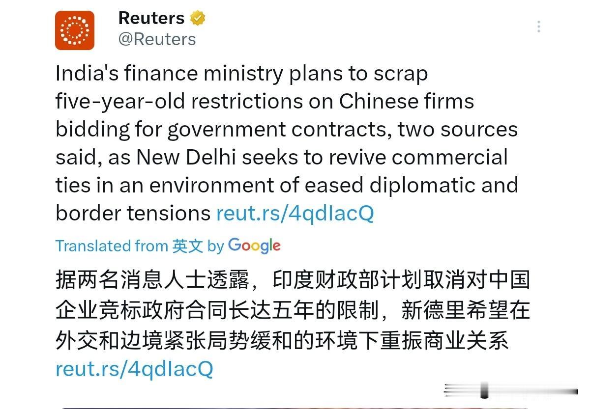 美国估计又要不高兴了!中印关系这一次往前面迈了一大步!1月9日,根据外媒报道,两名知情人士透露,印度财政部计划取消针对中国企业参与印度政府合同竞标、已实施五年的限制措施。外媒表示,此举正值中印两国外交关系缓和、边境紧张局势降温之际,新德里方面希望借此重振双边经贸联系。 若此事属实,这将是印度的又一次让步。印度正倾向于按中方主导的条件实现两国关系正常化,实际上已不再要求拉达克东部地区恢复到2020年以前的领土原状。印度的立场已悄然从“恢复原状”转变为“维护实控线沿线的和平与安宁”。很显然,此前中印两国因为边境冲突,中印经贸关系受到了不小的冲击,各方面活动都受到了限制。 但此番印度取消针对中国企业的限制,这无疑说明中印关系正走向不断转暖的轨道上来了。事实上,此前中印直航已经恢复,印度对华旅游,商务,媒体等签证也已经恢复,而2026年中印两国拟在印度举行中印高级别人文交流机制第三次会议,这一系列动作都说明印度对华政策变得越来越理性,务实。 显然,从美国的角度来看,中印出现走近的迹象,美国的印太战略就越发难以向前推进,这当然是美国不希望看见的。不过,就印度而言,美国仍在就关税问题对印度进行勒索,而美国国内又在酝酿新的手段对付印度对俄罗斯能源的采购,这个时候,印度当然没有理由接近美国。无疑,与我们继续改善关系,这是非常明智的选择。