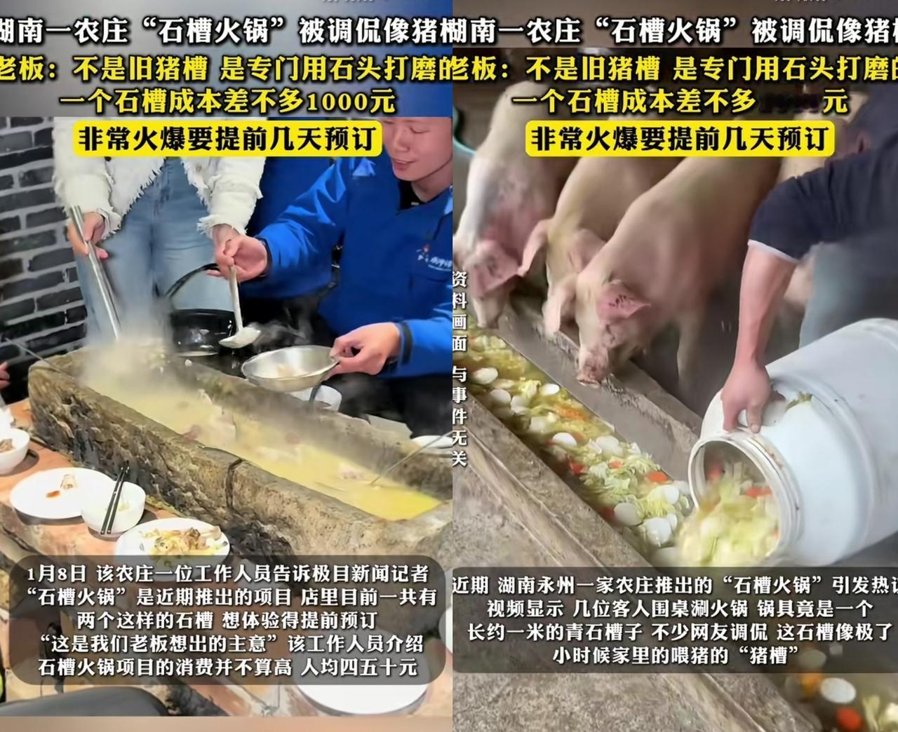 现在吃饭都这么“卷”了吗? 湖南一农庄“石槽火锅”被调侃像猪槽。 老板回应:艺术来源于生活,老板表示不是旧猪槽,是用石头打磨成的新槽子,店里总共就2个。可容纳8人用餐,“石槽火锅”非常火爆,如果需要还要提前预定。 老板还说了,每次顾客用完餐后都要拆下来清洗,干净卫生,不用担心。 商家的经营之道千奇百怪,只要顾客认可喜欢,那就是最好的经营理念。你们觉得呢?