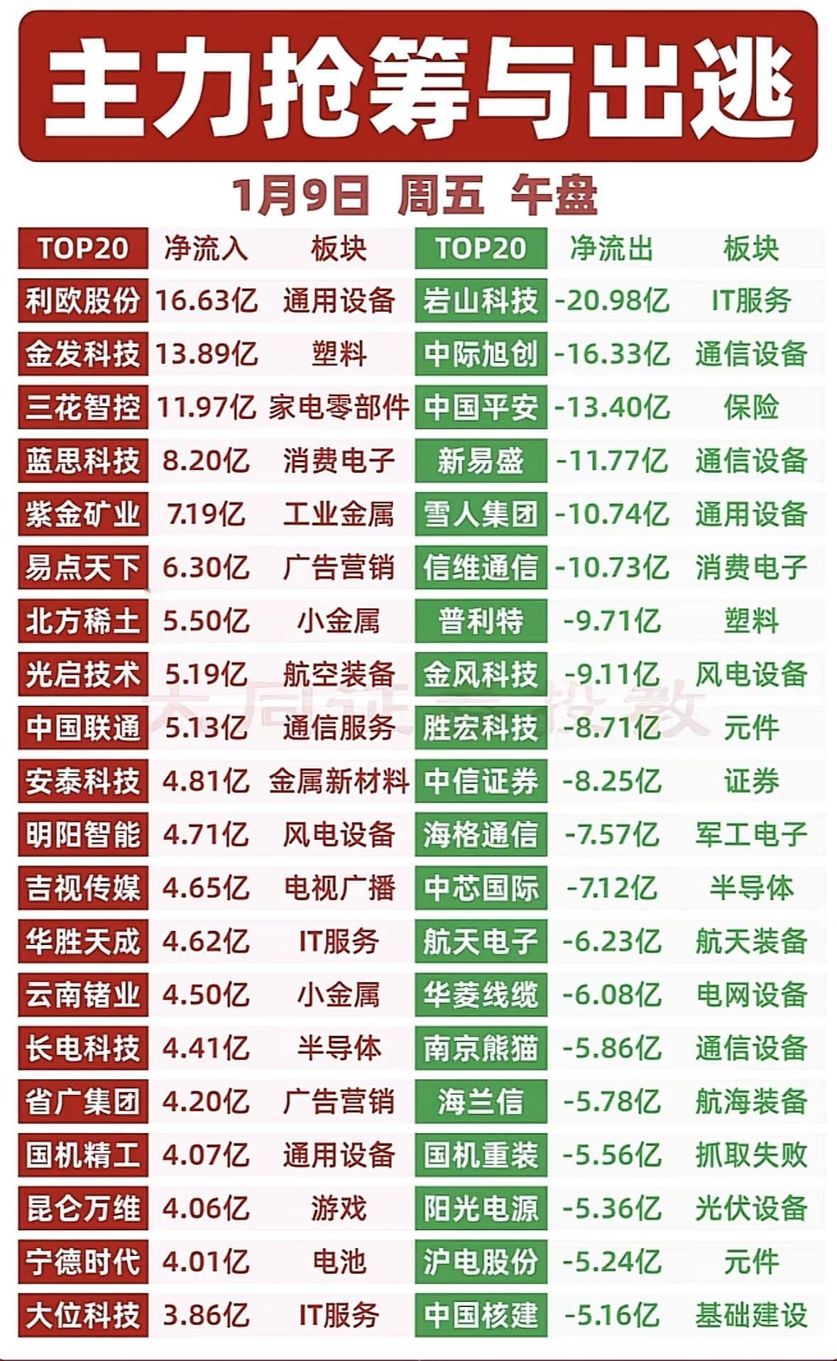 1月9日今日上午主力资金净流入与净流出前20名个股梳理。 主力资金动向:通用设备、IT服务获青睐,通信电子承压,板块分化明显。"