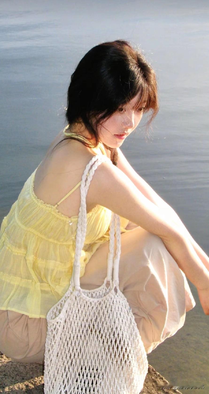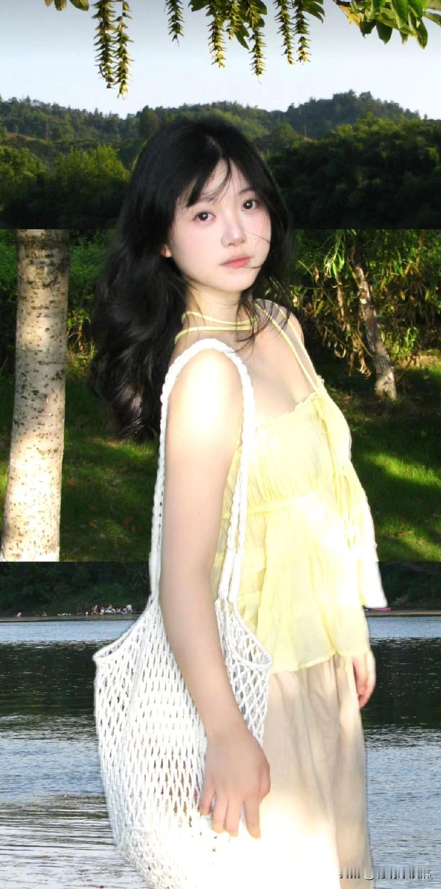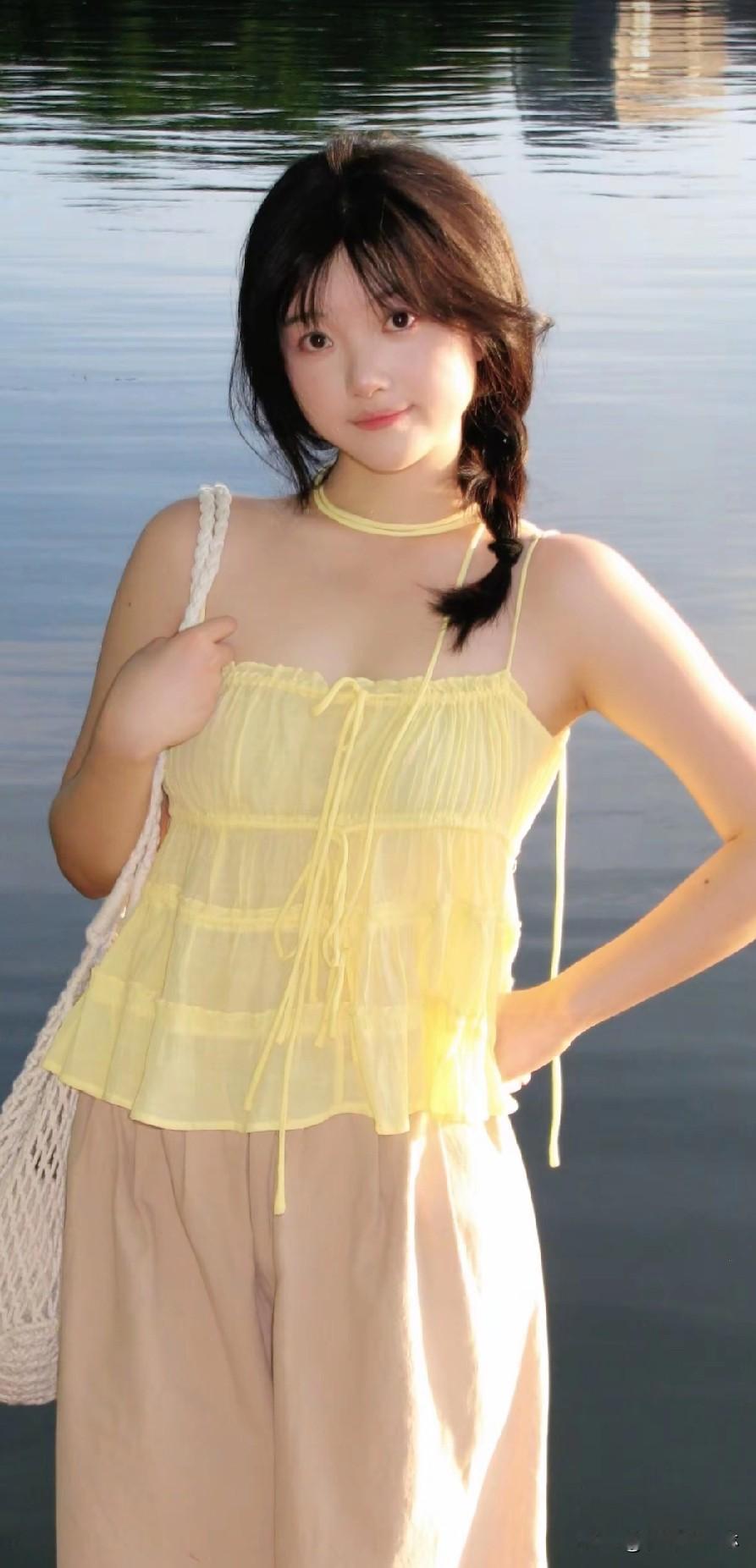 少女清新穿搭,黄色吊带裙搭配米色长裤,轻松惬意。
