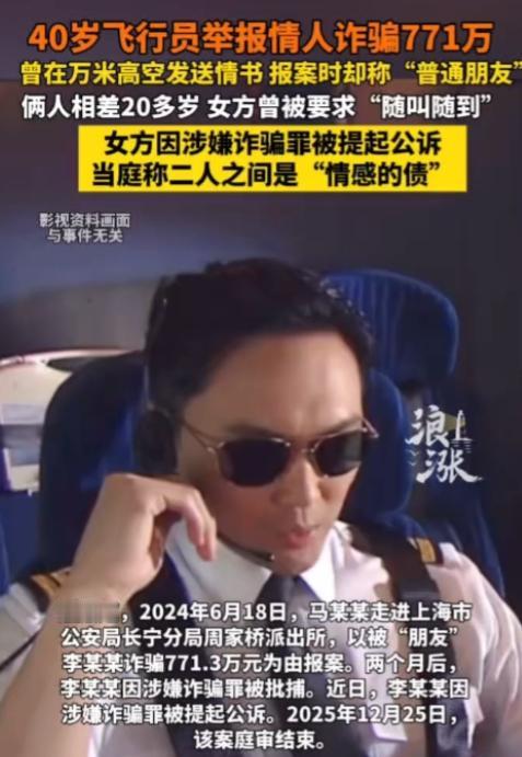 上海出新闻了! 上海这事儿看得人脊背发凉。40岁的机长,跟个女学生好了11年,从18岁养到29岁。5年里砸了700多万,豪车公寓随便送,看着多深情。 2012年的哈尔滨刚入秋,街头的梧桐叶还没完全变黄,18岁的李晴(化名)背着双肩包走出大学校门,眼里满是对成年世界的好奇。 那天她去参加一个朋友组织的聚餐,一进门就注意到了角落里的马勇(化名)。 男人穿着剪裁合体的衬衫,说话时声音沉稳,举手投足间都是成熟男人的笃定。 后来她才知道,这个被大家尊称为 “马哥” 的人,是国内某航空公司的机长,常年在万米高空穿梭。 两人加了微信后,马勇对这个刚成年的小姑娘格外上心。 知道她是学生没什么收入,过节时会发大额红包,听说她喜欢逛街,就带着她去上海的高端商场挑衣服,甚至主动提出要在徐汇区给她租套公寓,“这样你周末过来也方便”。 李晴那时候觉得,马勇就像一棵大树,能给她足够的安全感,虽然两人差了22岁,可他的温柔和大方,让她很快就沦陷了。 谁也没想到,这一好就是11年, 2015 年1月李晴生日那天,马勇正驾驶着客机在万米高空巡航,穿过厚厚的云层后,机舱进入平稳阶段。 他趁着机组休息的间隙,借着驾驶舱微弱的灯光,给李晴发了一条满是温情的消息:“宝贝,生日快乐呀。现在我在万米高空,离天空最近的地方,心里最想念的人就是你。” 这条带着高空浪漫滤镜的 “情书”,让李晴感动了好久,她截图保存了下来,逢人就忍不住炫耀马勇对她的好。 而李晴也不是一味索取,她曾给马勇买过最新款的手机、苹果手表,还兑换了5万美元,帮他支付在美国留学的儿子的学费,两人的ETC都绑定了同一张银行卡,资金往来早就不分你我。 从2018年开始,马勇对李晴的付出更是到了 “豪掷千金” 的地步。他在上海徐汇区租下一套带落地窗的高档公寓,配齐了所有家具家电,专供两人同居。 又买了一辆崭新的轿车,直接登记在李晴名下,让她出门方便,李晴说想自己创业开女装店,马勇二话不说转去几十万启动资金。 那些年里,马勇的飞行任务再忙,只要落地有空,一个电话打给李晴,她就得 “随叫随到”。 2020年,李晴短暂结了次婚,又很快离婚,这段插曲也没影响两人的关系,马勇依旧像以前一样对她大方,而她也继续维持着随叫随到的默契。 可谁能想到,这份维持了11年的 “深情”,会在2024年6月突然崩塌,那天马勇执飞厦门,落地后像往常一样给李晴打电话,让她过来陪宿,却意外遭到了拒绝。 “我这边有点事走不开”,李晴的语气带着些许敷衍,这让马勇瞬间动了怒。两人在电话里吵了一架,挂了电话后,马勇越想越气,这段关系里的付出和委屈,一下子涌上心头。 仅仅几天后,马勇就走进了上海市公安局长宁分局周家桥派出所。 让人意外的是,这个曾经为她在万米高空写情书的男人,在报案时却绝口不提11年的亲密关系,只说两人是2013年相识的 “普通朋友”,还拿出了一沓厚厚的转账记录,举报李晴诈骗他771.3万元。 他细数了三项 “诈骗事实”:虚构在泰国买房需要换汇的理由骗钱、以需要支付律师费和审计好处费为由要钱、谎称叔叔生病借钱,甚至提到当初的茅台酒代购,他只收到过21箱酒,剩下的钱都被李晴私吞了。 直到案件进入司法程序,证据链需要,他才不得不承认,俩人其实是长期的非正常男女关系。 2025年12月庭审现场的交锋,那叫一个精彩,公诉机关指控,李晴在得知马勇有泰国购房的换汇需求后,虚构了自己有特殊换汇渠道的事实,从2019年到2022年间陆续骗取200余万元。 2023年后,她又以 “换汇失败需要打官司” 为由,虚构了审计费、律师费等名目,再次骗取30余万元,这些钱款除了少量用于换汇和归还,大部分都被她个人挥霍。 面对指控,李晴当庭喊冤,她坚称自己不构成诈骗罪,与马勇是实打实的情侣关系,那些转账都是马勇自愿的情感馈赠,是两人11年感情里 “情感的债”。 她的辩护律师提出,这本质是 “以刑事手段解决经济纠纷”,双方长期存在 “包养式经济供给关系”,马勇的转账都是自愿赠与,并非基于李晴的诈骗行为。 截至庭审结束,双方依旧各执一词,马勇的转账记录和李晴的情感陪伴,究竟是赠与还是诈骗,只能等待法院的择期宣判。 从万米高空的情书到771万的转账流水,从 “随叫随到” 的恋人到 “普通朋友” 的报案说辞,每一个细节都让人唏嘘。 这场始于青春、终于牢狱的风波,不由得让人感慨,当感情掺杂了巨额金钱,当陪伴变成了互相消耗,最后到底谁能全身而退。 对于这件事,您有什么想说的吗?欢迎评论区留言讨论 信源:青岛新闻网2026-01-06——《70后飞行员举报"90后情人诈骗700多万元":报案时称"普通朋友",后承认是非正常男女关系;法院判了》