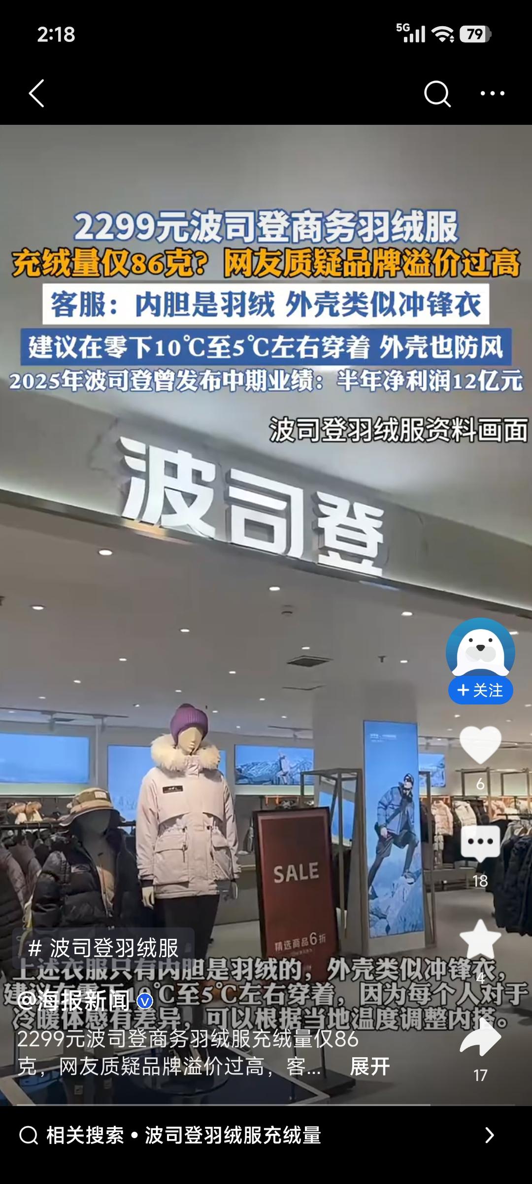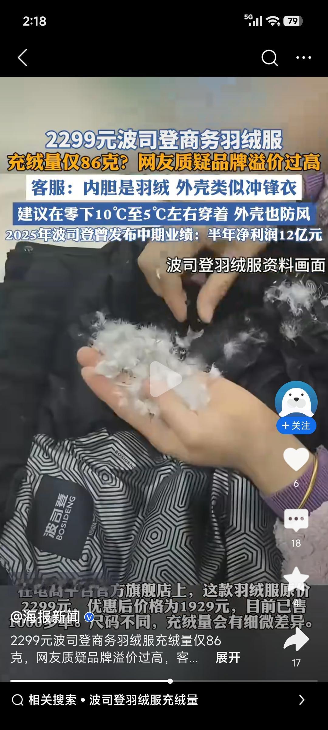 波司登一款2299元的商务羽绒服充绒量仅86克,这事儿可太有争议了。网友吐槽“每克羽绒比肉还贵”,也不是没道理。这款是2025年商务系列男款可脱卸内胆鹅绒服,绒子含量90%,蓬松度700FP,电商优惠后1929元,已售1000多单。 客服说尺码不同充绒量有差异,这衣服建议零下10℃至5℃穿。但花两千多买这么个充绒量的,普通消费者很难不质疑溢价过高。大家愿意为国货高端化买单,但不能只看个“logo”,品牌溢价得有实打实的价值支撑才行。