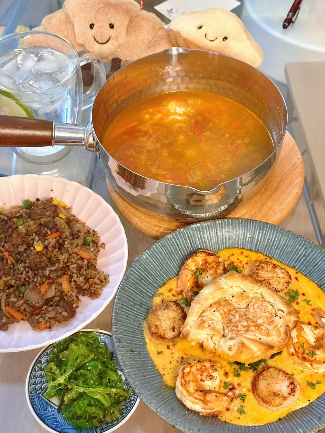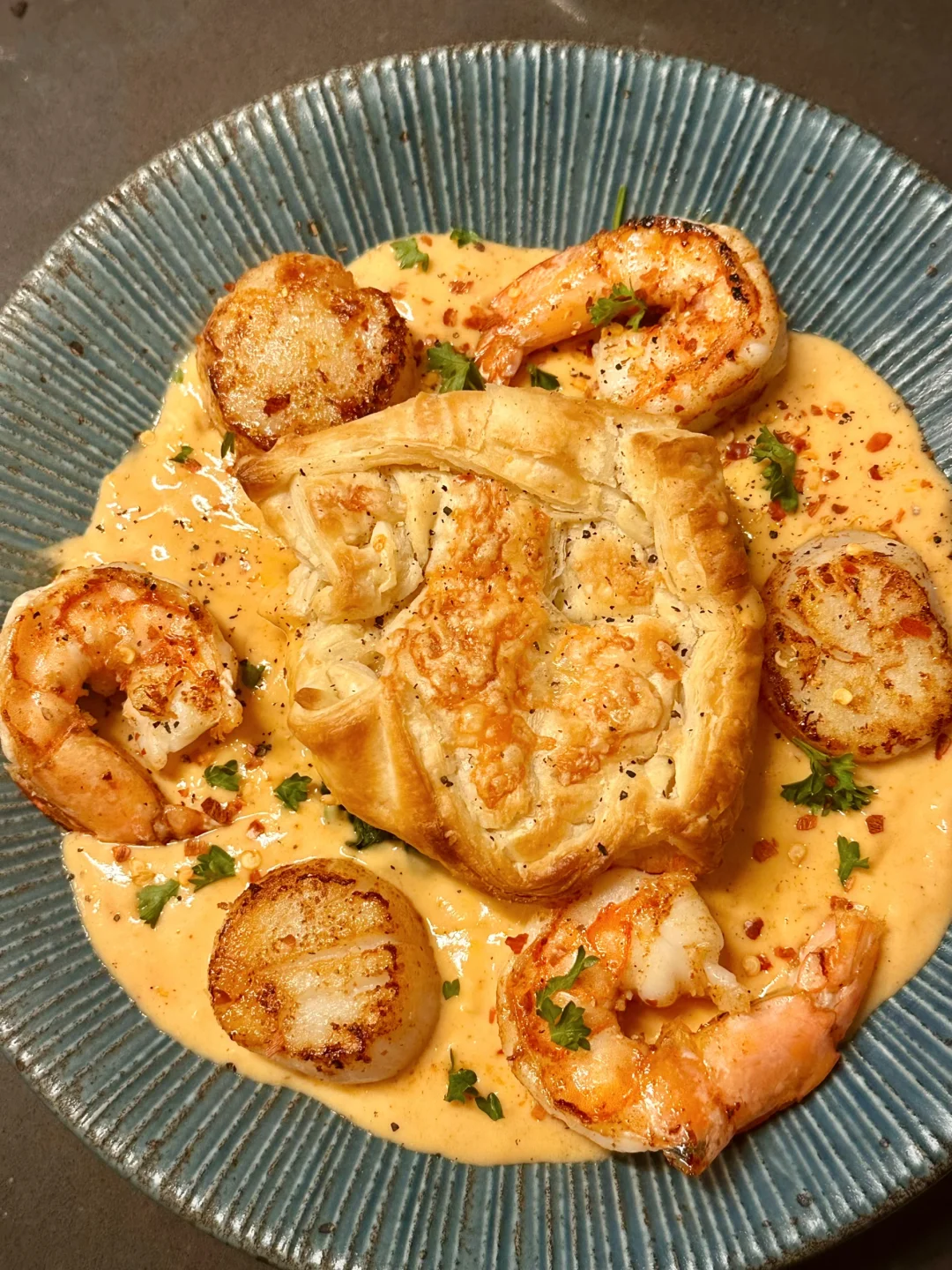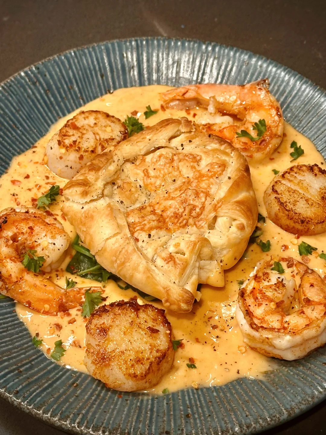 本来对迪士尼的食物没有报任何期待,但或许是鼠王给我们食运加持,吃到了一道非常美味的酥皮烩海鲜:大颗扇贝和虾仁喷香鲜甜,淋上浓郁醇厚的龙虾酱汁,还有金黄的酥皮可以蘸酱汁吃。我现在想到还觉得好好吃!