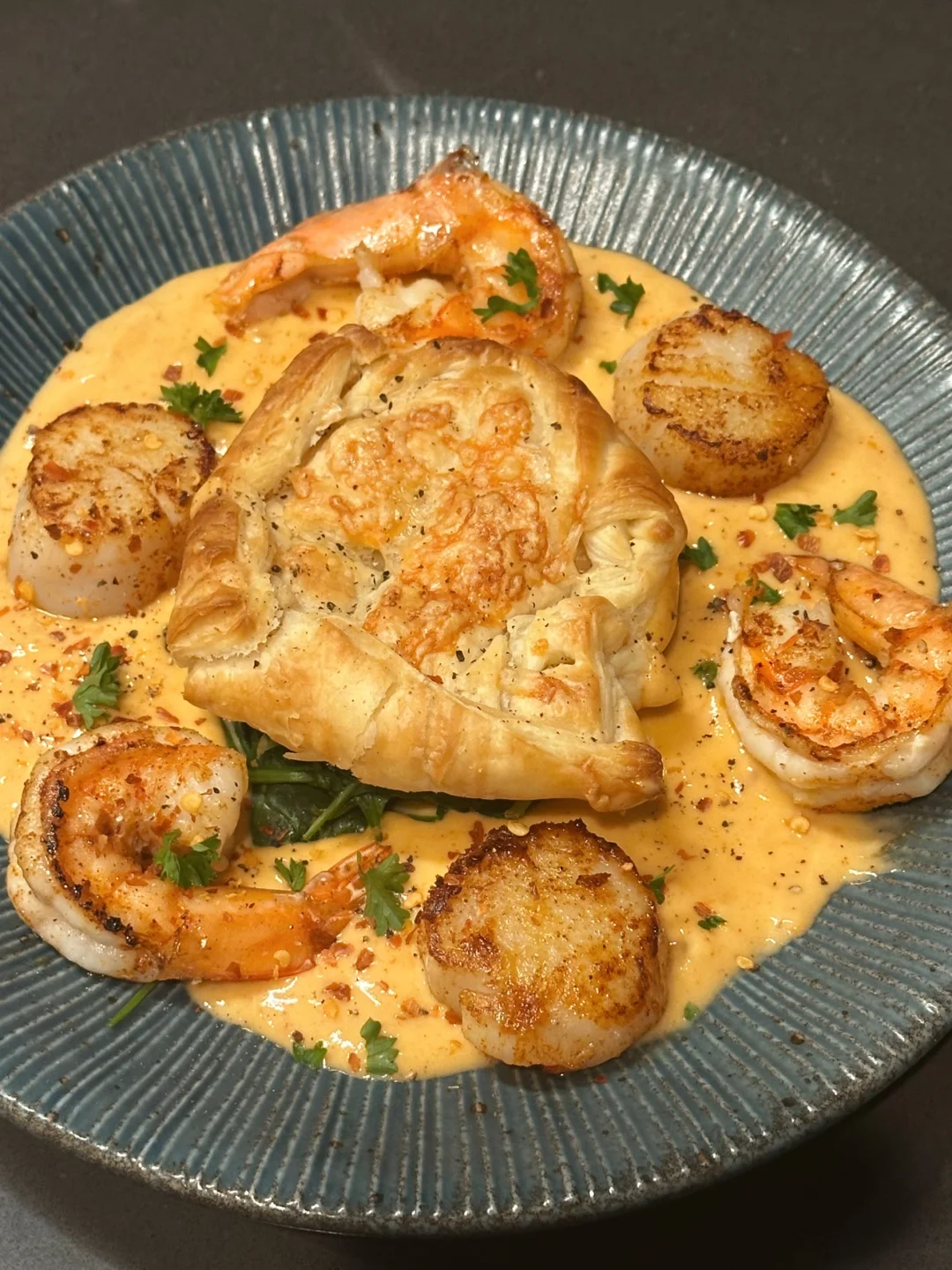 组装时刻!炒熟的菠菜捏成一个圆形小钵,顶上放酥皮,周围摆上虾仁扇贝,再淋上龙虾汤。可以根据自己喜好再撒点胡椒,我还点缀了欧芹,就完成了!