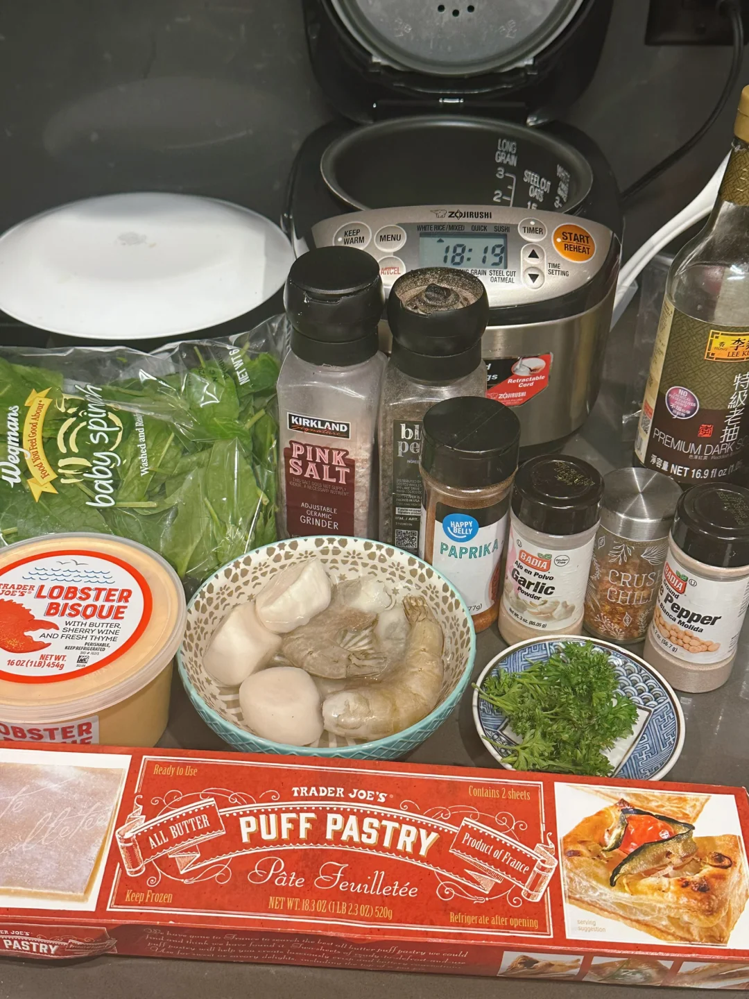 大虾3只,扇贝3个,白葡萄酒,paprika、黄油,盐,黑胡椒;酥皮一小块,奶酪(可选);菠菜一把,龙虾浓汤一小碗。