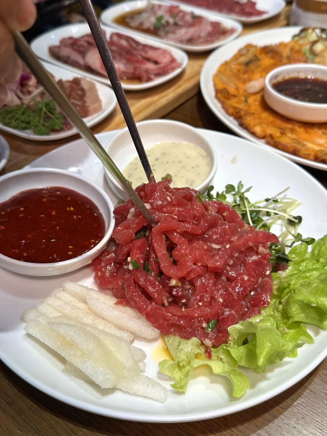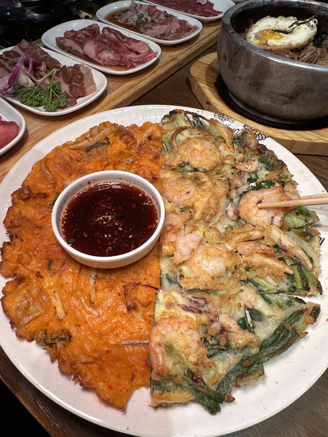 韩国人开了很多年的老店, 在韩国街,都是老客! 每次上桌小菜就有十几种! 土豆泥每次去都会吃一盘又一盘😅 · 牛肉拼盘,海鲜葱饼,1米芝士年糕都经常吃 上海上海旅游攻略上海韩料上海韩国街