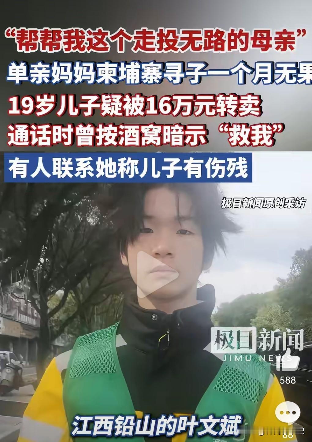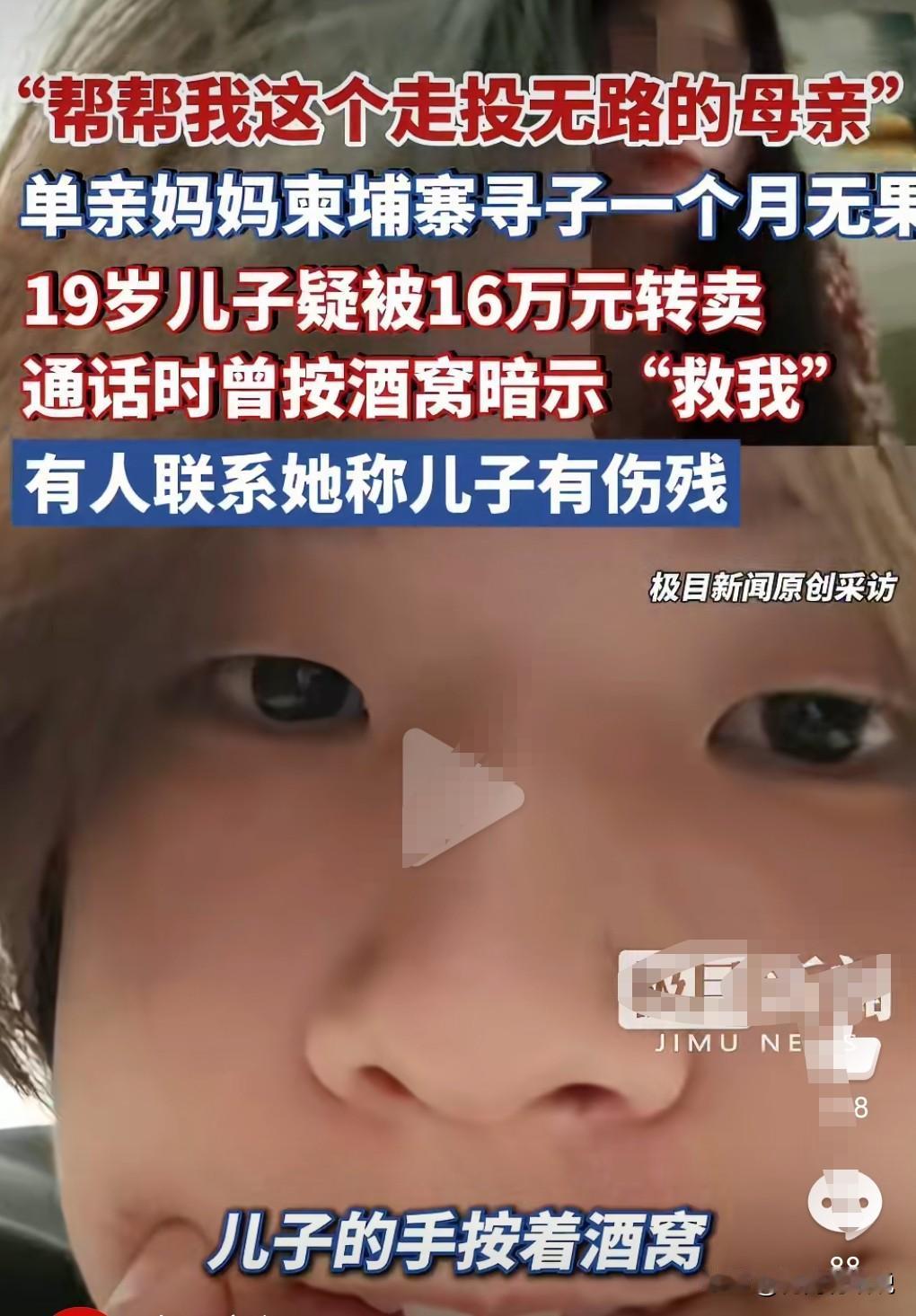 诈骗猛如虎啊,别再轻易相信网上的那些高薪招聘的信息了。 更不要去到边境的地方,因为有可能就是被骗到柬埔寨、缅甸这样诈骗高发的国家。 1月8日(报道时间),单亲妈妈柬埔寨寻子1个月无果。 失联小伙19岁疑被16万块转卖。 据说已经被折磨的伤残了。 儿子在和母亲通话时曾按酒窝,后来母亲觉得这是儿子在向她求救,酒窝等于“救我”。 希望有奇迹,希望小伙能平安归来。