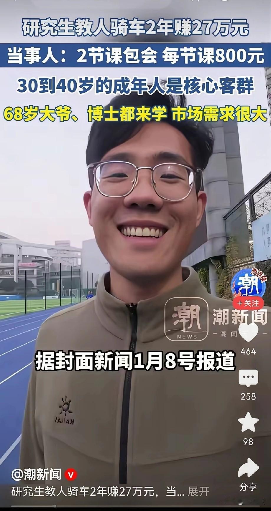 年轻人赚钱不走寻常路,一般人还真想不到,这样居然可以赚钱,而且还赚了不少钱!研究生教人骑车,多么简单的事情,这位研究生却做成了大事业,800 块钱一节课,2 节课包学会。而且前来学习的人络绎不绝,不但有老大爷,还有博士生,现在骑车的认怎么这么少呢?本来骑车多么简单的事情呢!自己蹬几回就可以上手了,有人居然愿意花 1600 学骑车,多么不可思议的事情!