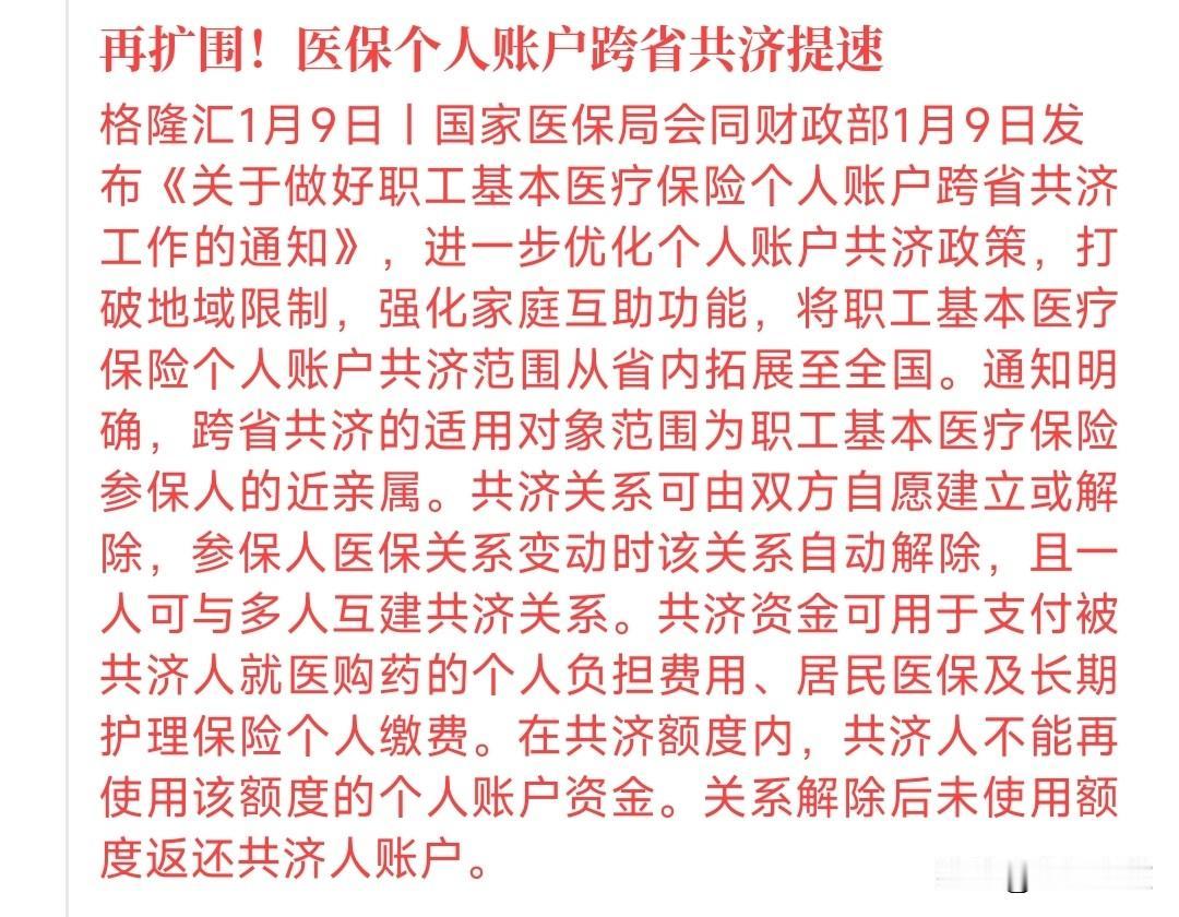 职工医保个人账户的钱,现在能跨省给家人用了 原来是医保里面的钱在哪个省交的,就必须在哪个省用。 现在是你的配偶、父母、子女这些近亲属,不管他们在哪个省都行。这对于给在外地工作的人为父母付费增加了保障,也让更多的人能够享受医疗保障了。 但是要注意:你把账户里的钱划给家人用,这部分额度你自己就不能再用了;要是解绑了,没花完的额度会退回你的账户。 总体上就是保障了更多的人能够医疗保障,尤其是老人可以用孩子的医保的钱,这将为老人多了一层保障。