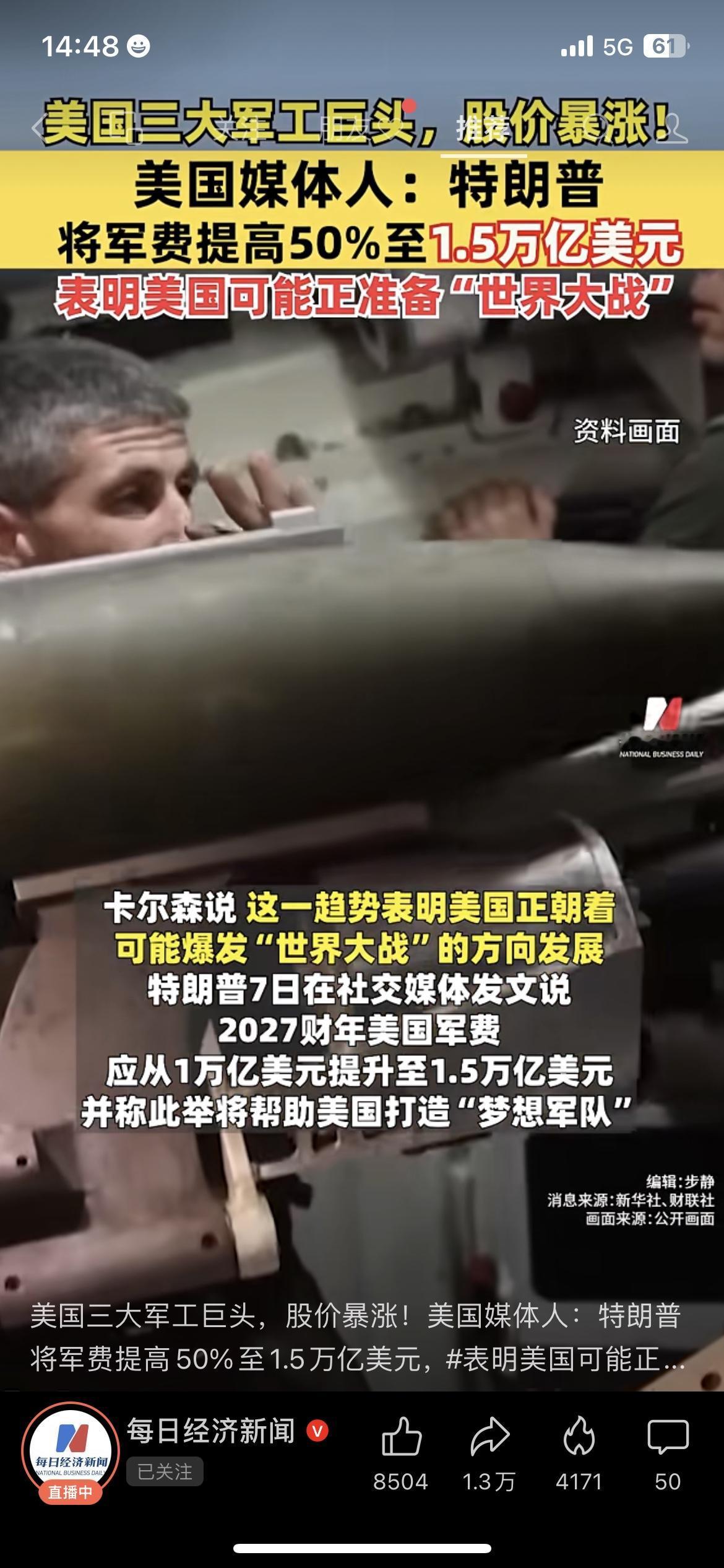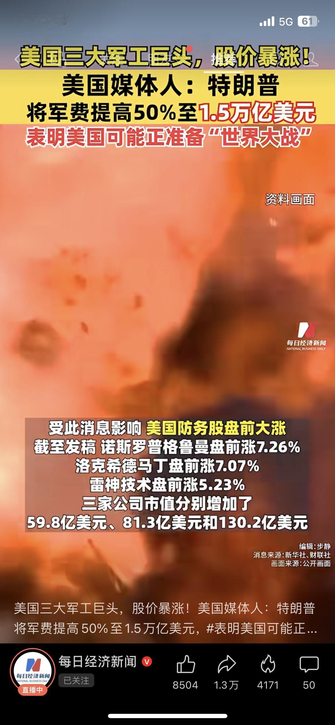 🔥特朗普砸1.5万亿军费!美国军工股集体狂飙,媒体人直呼“备战世界大战”? 特朗普一句话,美国军工巨头直接嗨了!🇺🇸 7日特朗普突然放话:要把2027财年军费从1万亿提到1.5万亿美元,涨幅整整50%,还说要打造“梦想军队”。 结果美国三大军工股立马暴涨: ✅诺斯罗普格鲁曼涨7.26%,市值多了59.8亿美金 ✅洛克希德马丁涨7.07%,市值涨81.3亿美金 ✅雷神技术涨5.23%,市值飙130.2亿美金 三家合计多了270多亿美金,这波军费预期直接让军工板块吃满红利! 更让人警惕的是,美国媒体人卡尔森直言:1.5万亿的军费规模,就是一个国家在为全球或地区战争做准备,甚至暗示美国在朝着“世界大战”走… 💬你觉得特朗普加码军费是真备战,还是只为军工资本站台?评论区聊聊! 美国军费 军工股 国际局势 特朗普军工股行情