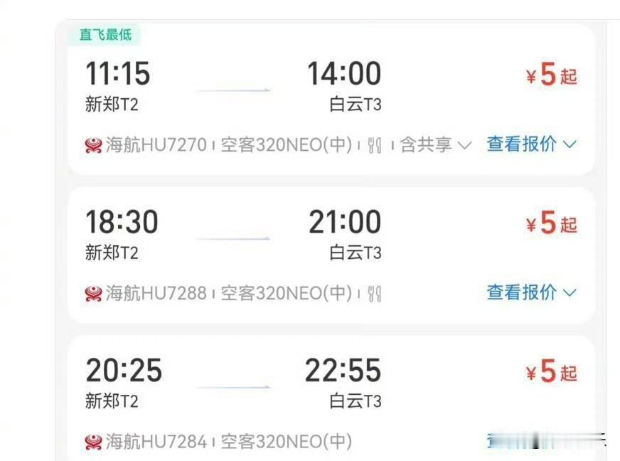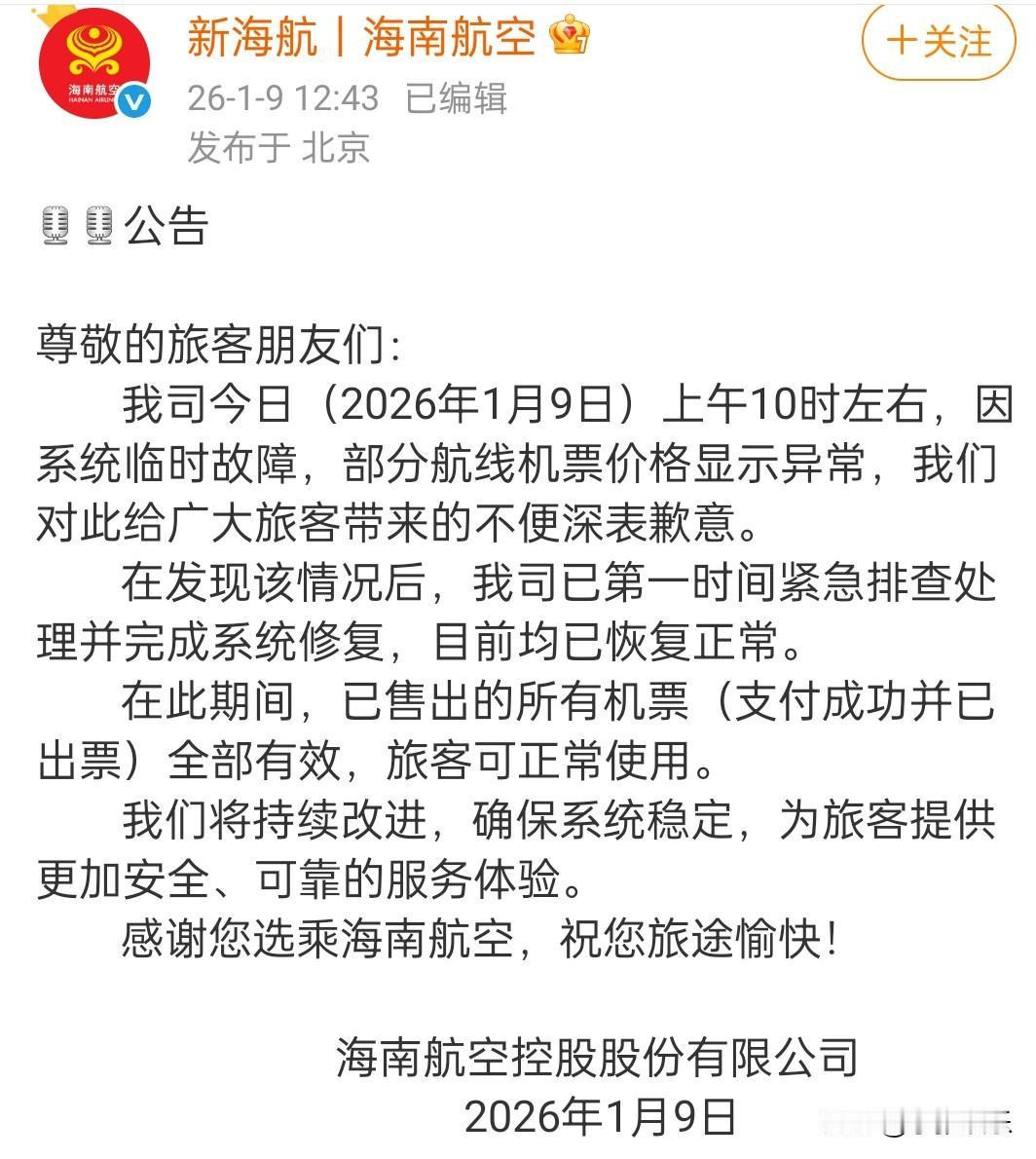“过期的羊毛,犹如砒霜”,9日上午买机票像“捡漏大赛”?郑州飞广州只花5块钱,哈尔滨飞三亚360元还免费改签……今天不少网友刷屏:海航系统出bug了?! 多名网友晒出截图,从广州到北京130元,武汉到哈尔滨两大一小900元,有人甚至只付了一顿早餐钱就拿下跨省机票。大约20分钟后,价格恢复正常,但已经手快下单的人乐开了花:“这算不算年度最值操作?” 中午,海南航空火速回应:确实因系统临时故障出现价格异常,已紧急修复。但最让人惊喜的是——所有支付成功并出票的机票,全部有效!