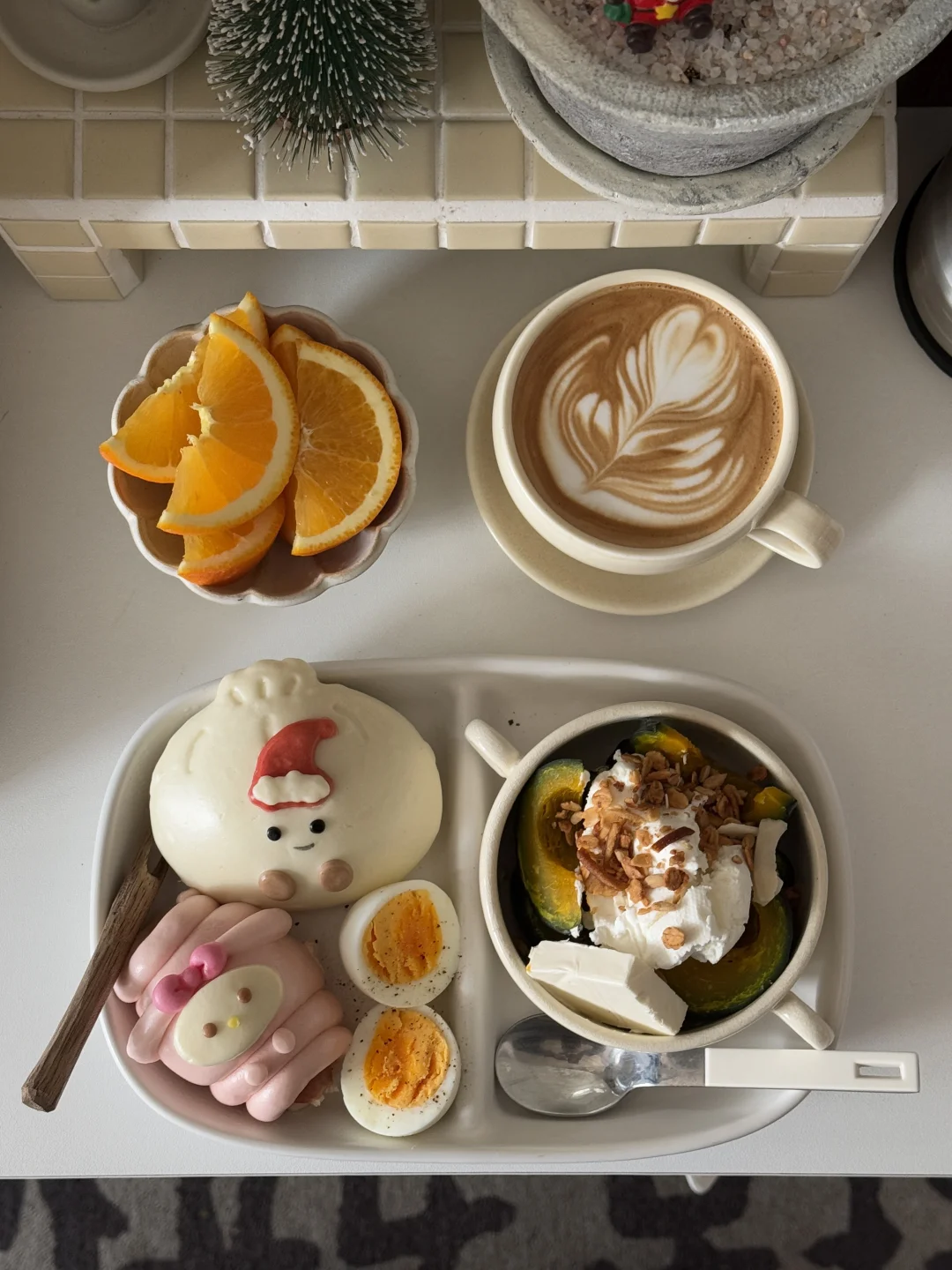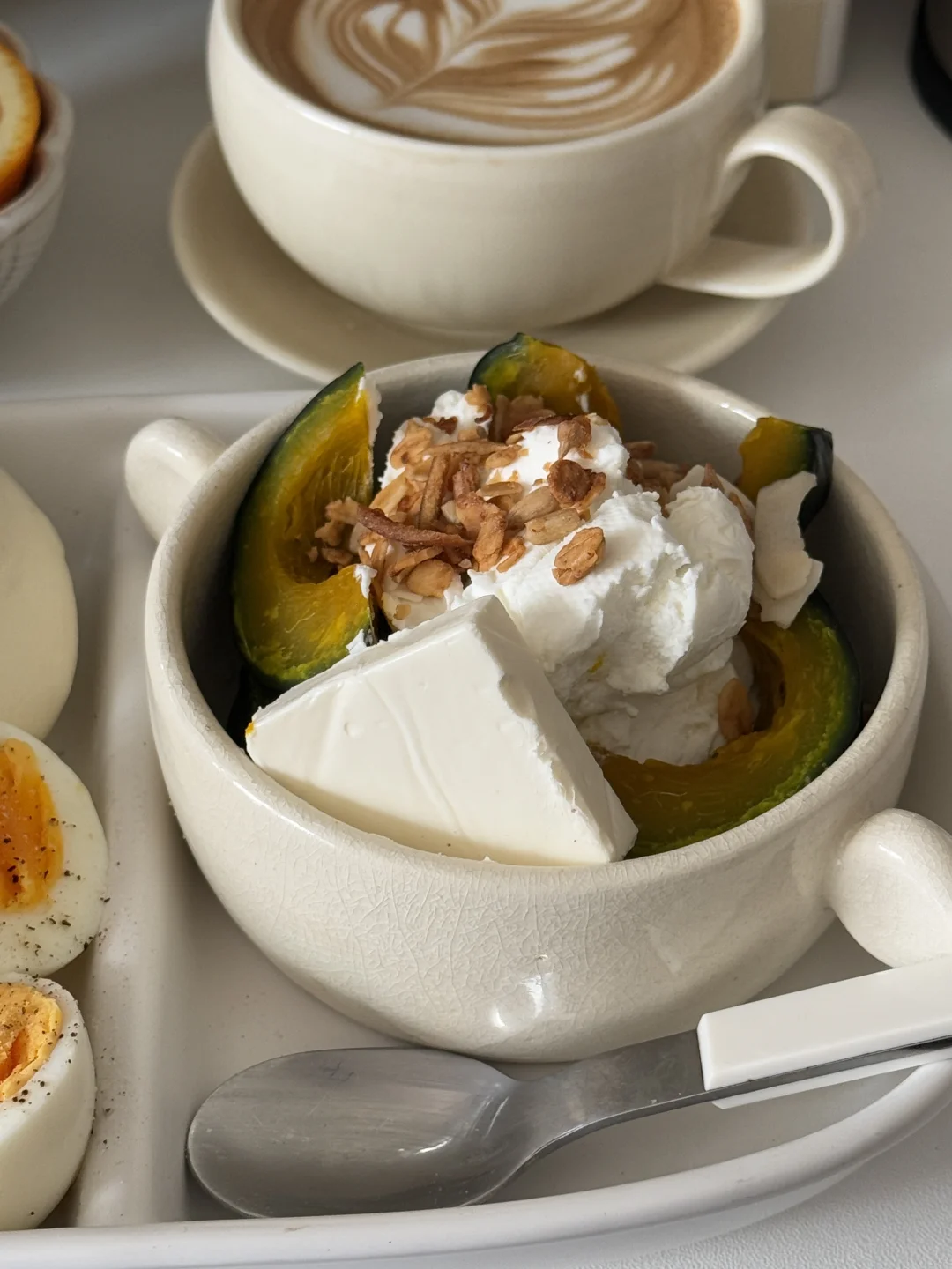 贝贝南瓜切块🔪 跟包子和鸡蛋一起蒸熟 贝贝南瓜稍微放凉后加入厚酸奶🥄 🧀还额外加了一块奶酪和麦片 - 这个组合是可以吃的 很糊嘴 贝贝南瓜粉粉的 真的是要细嚼慢咽每一口才行[暗中观察R] -