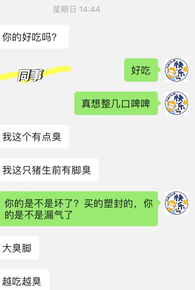 26年开工第一天早会领导就笑眯眯的和我们说!新年开工第一天给你们准备了点惊喜! 我们都以为有开工红包[暗中观察R][萌萌哒R][萌萌哒R][皱眉R][皱眉R]结果领导说下午茶请我们吃点好的! 我们听后也挺开心,早上就开始期待下午茶有多豪华 同事说一定会有奶茶!水果!蛋糕! 没想到一人发一个猪蹄子[笑哭R]全公司下午一起啃猪蹄子,那场面绝了 最搞笑的是我同事说她那只猪脚臭哈哈哈