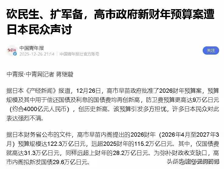 感觉高市的位子坐的不一定稳了,如果日本还有有识之士的话,也许不会容许她再这样上窜下跳了。我们过去有句老话,叫做皇帝无德民遭难,这话说的非常形象,说的非常深刻,老祖宗早就悟透了这个道理,作为一国首相,尤其是一个新上来的首相,没有给老百姓带来实实在在的民生福祉,反倒是生出很多的事来,时间长了,老百姓是会明白的,这样的人不适合当首相!