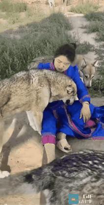 这究竟是狼还是狗?从个儿头儿上看,感觉有些不像是狼,我觉得狼应该比这个大一些,但是从颜色上看,以及尾巴耷拉着的状态,又有点像是狼,有一种狗叫捷克狼,不知道这几个是不是这东西。也有人有人说这是几只狼,说是这个女孩以前救助过它们,它们见到女孩之后,仍然是比较亲近,我觉得这倒像是一个故事,不像是真事!
