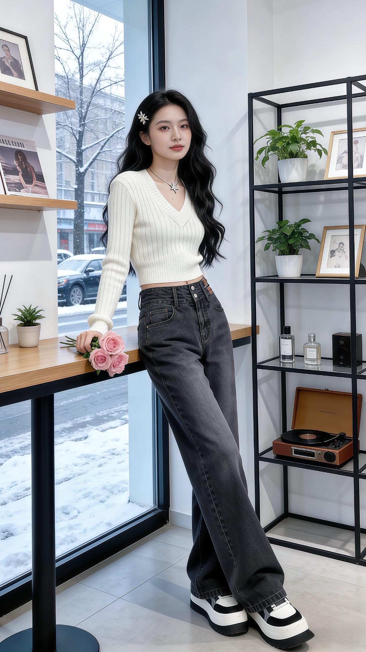 优雅东方韵,浅蓝上衣配米色长裤,漫步古风庭院,尽显时尚与古典的完美融合。