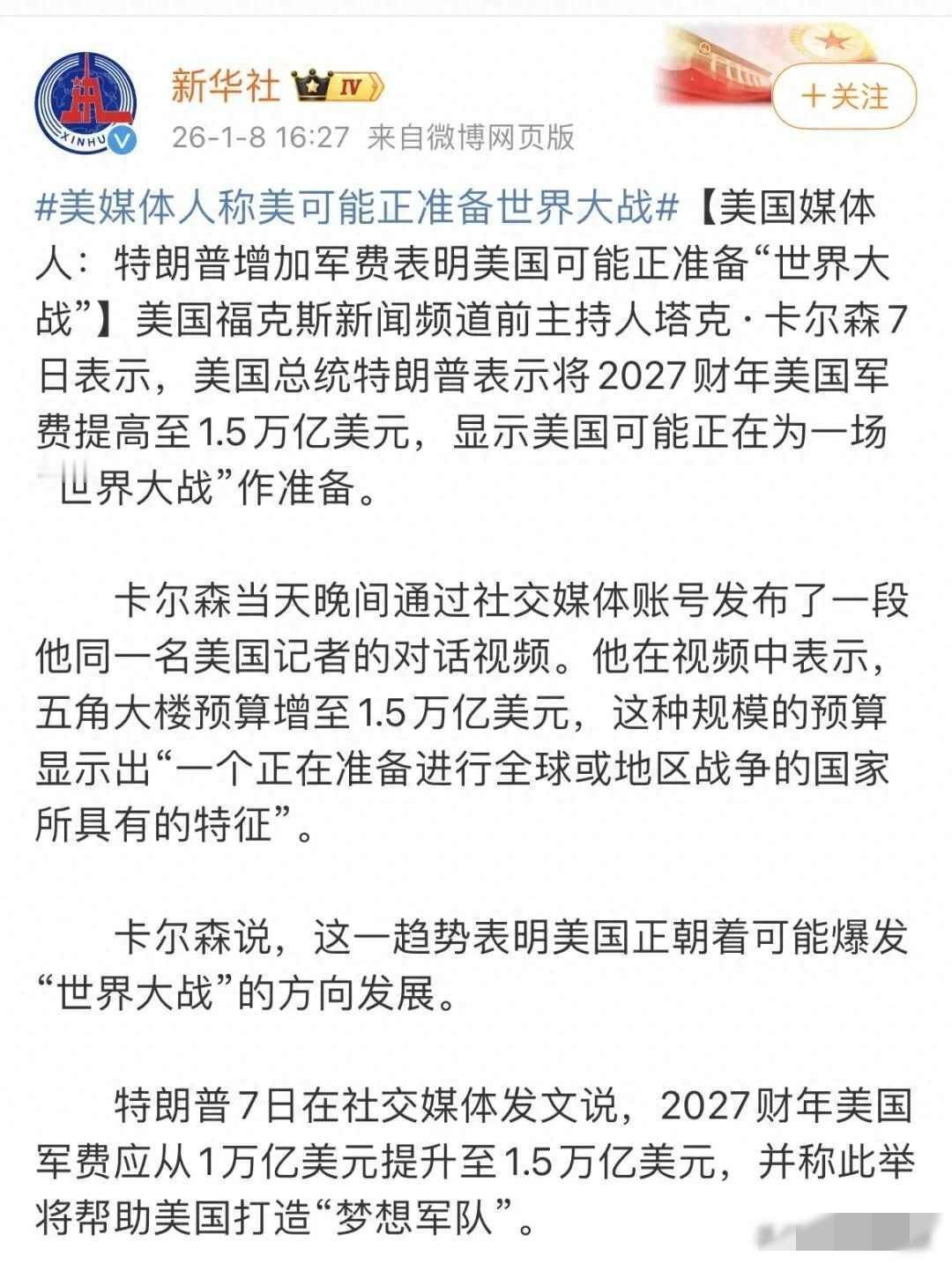 特朗普喊出1.5万亿军费,卡尔森火上浇油,年轻人刷屏当段子看 特朗普在社交平台上说,2027年要花一万五千亿美元来打造军队,还把这支军队称为“梦想军队”,这个说法被前福克斯主播卡尔森看到后,他马上发布视频表示支持,觉得这笔钱数目太大,只有准备打仗的国家才会这么干,他的观点在右翼圈子里引起很大反响,但自由派媒体直接批评他胡说八道,认为他是在故意带节奏。 其实这个数字根本没完成全部流程,现在2025年军费是8860亿,明年估计9400亿,按正常增加速度,2027年最多也就一万亿出头,要涨到1.5万亿的话每年得提高25%以上,但过去从来没有这么大幅增长过,五角大楼到现在也没回应这种说法,国会还没开始投票,所以这也就是个竞选口号罢了。 这件事和选举绑得太紧,去年军工企业的财务报告都很亮眼,雷神公司和洛克希德公司预测订单会增长三成多,年底时美国国防法案悄悄增加了高超音速武器和网络战部队的内容,这些钱不会白花,背后是资本和政治在互相支持。 从全球范围来看,美国的军费数字显得特别高,中国今年军费增加百分之七,俄罗斯的军费占国内生产总值的百分之四点三,总额却不到六百亿美元,美国的一万五千亿美元军费差不多等于全世界军费的四成,欧洲那边德国计划支出八百五十亿欧元,法国是六百亿,但没人敢说要翻倍,这不像是在防备谁,而是想让别人不敢轻举妄动。 卡尔斯现在代表独立媒体,他以前被主流平台封过,说话特别能调动情绪,上次他说美俄快要打核战争,结果全是假消息,这次虽然没有官方背书,但他和特朗普关系近,话一出口就成了动员工具,TikTok上“军费”话题的浏览量超过38亿,其中七成推给了18到34岁的年轻人,大家不关心预算怎么算,只当成热闹来看。