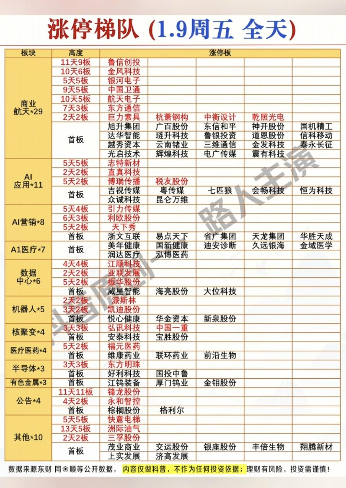 1.09周五 涨停板股票:题材+高度! 涨停92家 跌停1家 涨跌比3920:1349 1.商业航天 29股涨停 2.智能体AI应用 26股涨停 3.可控核聚变 4股涨停 4.人形机器人 5股涨停 5.数据中心 6股涨停