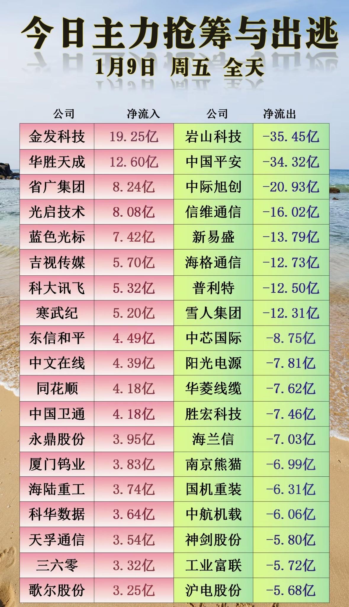 1月9日今日主力抢筹与出逃公司一览,净流入净流出数据大公开!📈📉 主力资金动向:部分科技股获青睐,金融与通信板块遭抛售,市场分化明显。