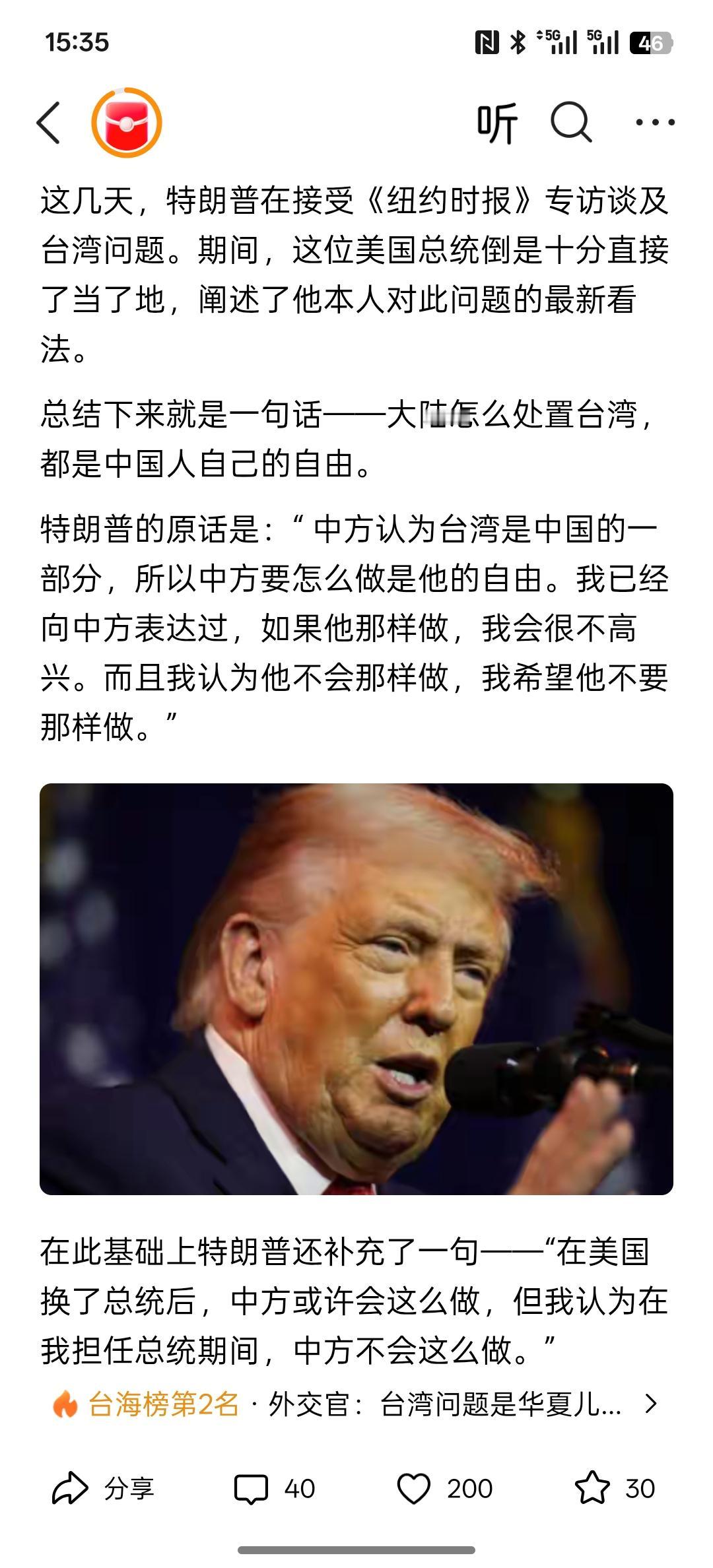 特朗普承认大陆怎么处置台湾,都是中国人自己的自由。解决台湾问题是中国人自己的事! 关于台湾问题,本来就是中国自己的事情,台湾是中国的领土,外界也可能认为中国会效仿美国对委内瑞拉所做的那样的事情得到一定的启示! 当然,特朗普也说,如果在他当总统时期,中国改变台海现状,他会感到非常不悦! 关于谈个问题,反正迟早是要祖国统一,台湾要回归!这也是不容争议的事实!只是时间问题!是我们这一代人能够看到的,祖国的繁荣与昌盛! 所以外部的干涉以及干扰都阻挡不了中国统一的步伐! 以日本这样的国家企图妄为,用涉台言论来为台独分子撑腰。中国将严厉打击!