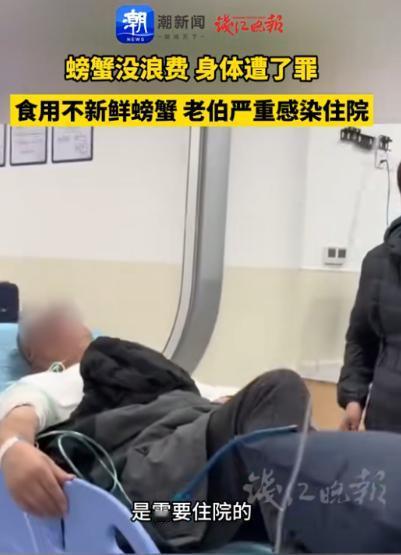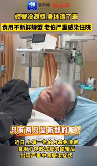 “悲剧还是发生了!”近日,上海,一老人为避免浪费,将家中存放三天的大闸蟹煮熟吃光,没想到吃完不久后就开始上吐下泻,发起了高烧,家人见状连忙将他送往医院诊治,发现是因为食物中毒引起的严重感染。网友:该扔就得扔! 事情发生在上海某老小区。老人姓周,70多岁,退休多年,平日里生活节俭,是典型的“老一辈过日子”的观念。 几天前,周大爷的儿子来看望他,顺手买了几只大闸蟹放在冰箱里。本想着第二天就吃,但因为家里临时有事,蟹一直没来得及处理,就这样在冰箱里放了整整三天。 第三天晚上,周大爷打开冰箱时,发现大闸蟹已经明显没有之前那么鲜活,有的腿微微发软,还有一股若有若无的腥味。 可他转念一想:“这么贵的东西,扔了多可惜啊,现在条件好了,更不能糟蹋粮食。”抱着“煮熟了就没事”的想法,周大爷把几只大闸蟹全部下锅,反复加热,足足煮了二十多分钟。 吃饭时,周大爷还特意蘸了姜醋,觉得味道比之前差了一点,但并没有太在意。他一个人把几只螃蟹吃得干干净净,甚至还念叨:“现在的年轻人动不动就扔东西,一点都不懂得珍惜。” 然而,没过多久,周大爷就开始觉得肚子不舒服。起初只是腹胀、反胃,他以为是吃多了,坐在沙发上休息了一会儿。 可不到半小时,情况急转直下,他开始频繁呕吐、腹泻,整个人脸色发白,冷汗直冒。家人发现不对劲时,周大爷已经站都站不稳,体温迅速升高,浑身发抖。 家人立刻拨打急救电话,将他送往医院。急诊科医生接诊后,迅速进行了检查,初步判断为严重的食物中毒。 化验结果显示,周大爷体内存在明显的细菌感染迹象,可能与变质水产品有关。 医生解释,大闸蟹属于高蛋白食物,一旦死亡或存放不当,极易滋生细菌和毒素,即便高温烹煮,也未必能完全破坏其中的有害物质。 由于周大爷年纪较大,基础代谢慢,免疫力相对较弱,这次中毒反应来得又快又猛,医生当即安排他住院观察,并进行抗感染和补液治疗。 所幸送医及时,经过一夜抢救,病情逐渐稳定,没有引发更严重的并发症。 事后,医生在接受采访时再次提醒:像螃蟹、贝类这类水产品,一定要确保新鲜,存放时间过长、已经死亡的,坚决不要食用。 尤其是老年人,更不能抱有“煮一煮就没事”的侥幸心理。节俭是美德,但健康永远排在第一位。 这起事件被家属发布到网上后,很快引发热议。不少网友直呼“太心疼了”,也有人感叹:“老一辈是真的舍不得扔,但有些东西该扔就得扔。” 还有网友现身说法,分享自己或家人因为吃隔夜海鲜、变质食物而住院的经历,提醒大家引以为戒。 评论区里,一条高赞留言写道:“节约不是拿命换,食物一旦有风险,扔掉比进医院便宜多了。”也有网友表示理解老人的想法:“那一代人吃过苦,对浪费特别敏感,但现在真的要更新观念了。” 目前,周大爷仍在医院接受后续治疗,精神状态已经明显好转。家人表示,这次经历给全家都敲响了警钟,以后不论多贵的食材,只要存在安全隐患,绝不会再犹豫。 正如网友所说:勤俭节约值得提倡,但在食品安全面前,“该扔就得扔”,才是对自己和家人最大的负责。