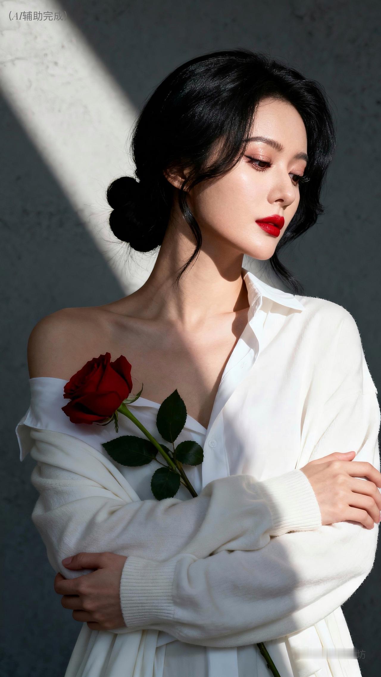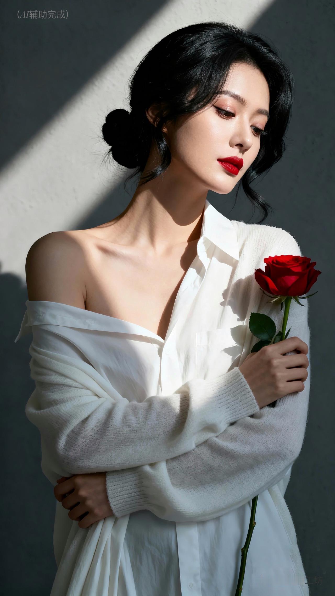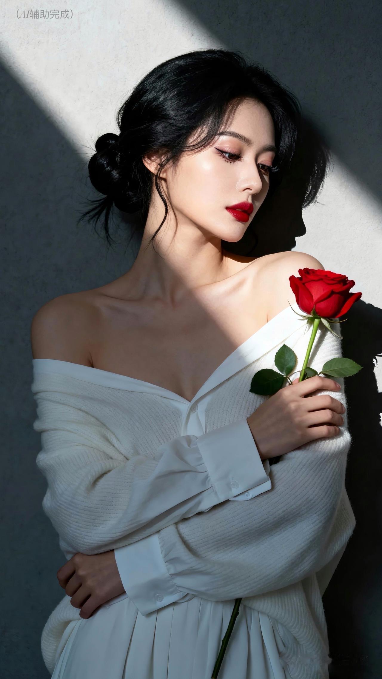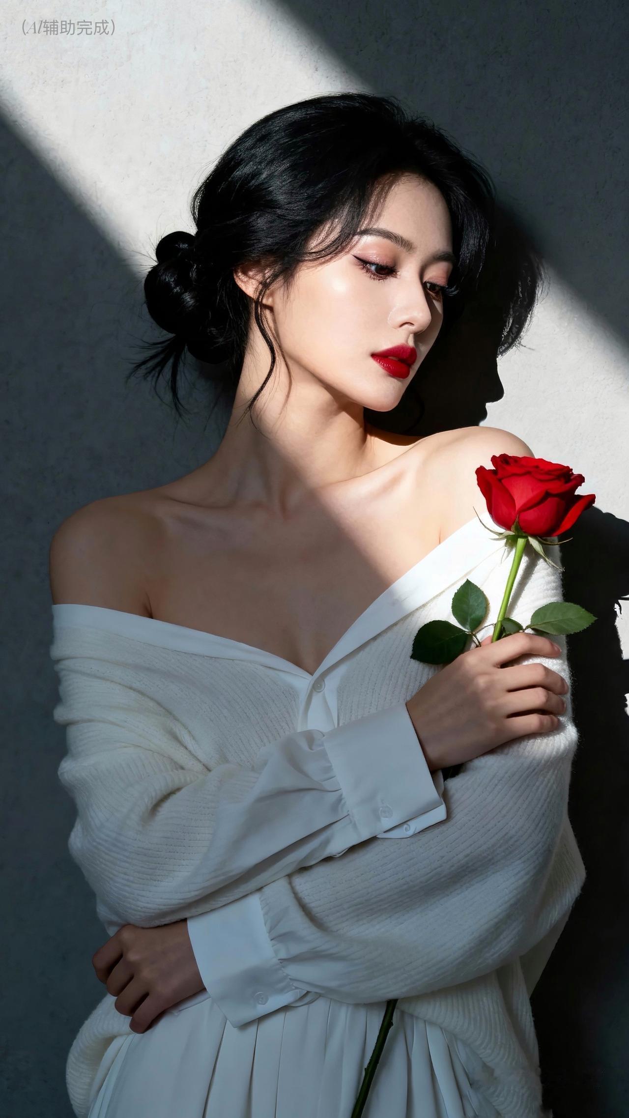 乌黑卷发如绸缎垂落,发丝光泽亮丽,白毛衣裹着温柔。她眉形精致,眉眼含情眸亮如星,