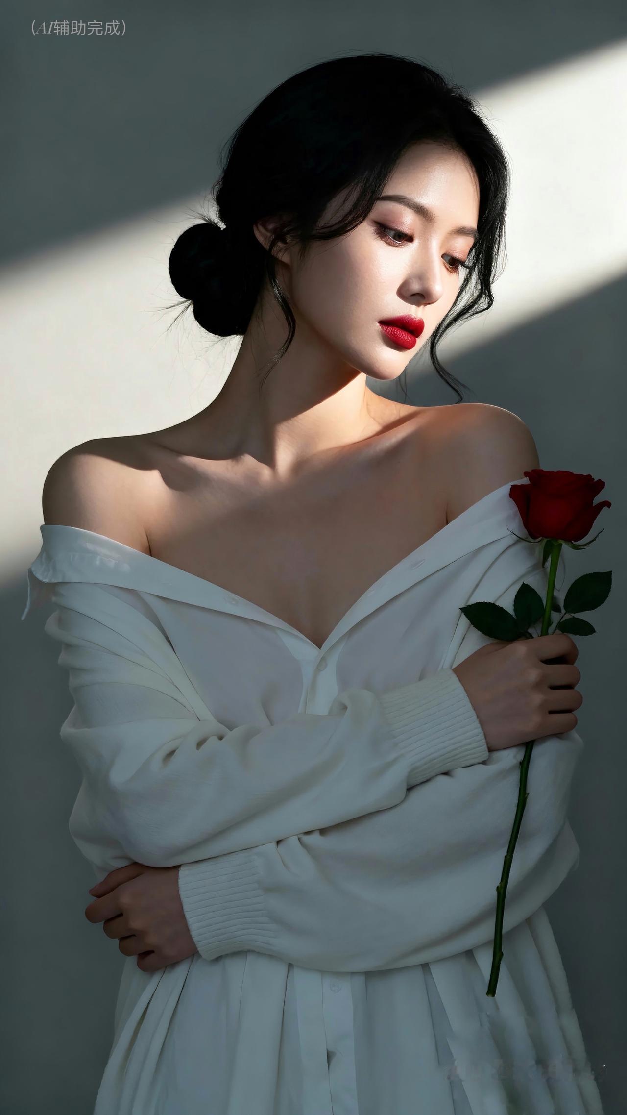 薄荷绿毛衣裹温婉,乌黑辫垂肩泛柔光。银环耳坠添时尚,手捧玫瑰笑靥甜。眉眼弯弯眸藏