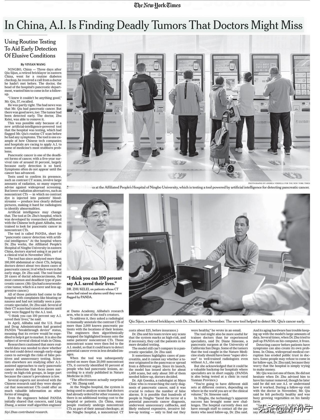 2026刚刚开始,外媒发布一个消息,事关中国科技,风向真的变了! 《纽约时报》发表了一篇题为《AI正在中国发现医生可能遗漏的致命肿瘤》,这篇文章报道了一位57岁的邱先生,在例行糖尿病检查时,阿里达摩院胰腺癌筛查AI模型PANDA筛查出了他罹患早期胰腺癌。 胰腺癌又被称为癌症之王,五年生存率仅为5%-10%,因为隐匿性非常强,很多患者往往发现的时候就已经是晚期了,如果能早发现早治疗,患者的生存率能大大提高。邱先生正是被技术拯救的其中一个,目前已做完手术,成功切除。 这篇文章一发出,美国的网友破防了,因为在他们看来,中国的AI用到了治病救人方面,而美国的AI则将更多精力用到了捞钱上去。 比如,有美国网友就在这篇文章下面评论到:“看见没,这才是新兴技术的正确用法。可惜这种方法在美国的体系里行不通——因为投资者捞不到钱。” 也有网友表示:“中国科技巨头的AI可以检测肿瘤。中国的平扫CT是常规检查,医保报销前费用仅为5美元。美国科技巨头的AI则被用来制作深度伪造视频以牟利。” 通过这些网友的评论和《纽约时报》报道的案例。能得出一个结论。 那就是阿里达摩院用AI来筛查癌症的这个举措,放眼世界,不仅技术领先了不说,还让AI科技有了温度,真正帮助到了普通人。 同时,从这件事上美国网友的态度也能反应出,中国科技公司和美国科技公司走的道路是不同的,咱们的AI技术已经逐步解决实际问题,在医疗领域救人的时候,海外的科技公司还在研究怎么更快赚钱,更好地替代普通人的工作。 这种截然不同的AI技术方向,和对于技术应用的态度,也代表了东西方不同的行为逻辑,这大概也是我们这些年能发展的越来越快的关键! 也相信在这种技术思想的推动下,未来中国在科技方面必然会取得全面领先!