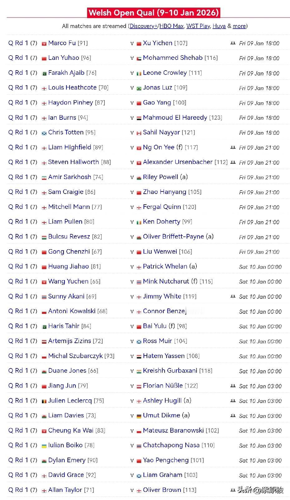 威尔士公开赛资格赛第一轮今天18点开打,今晚明晨一共进行31场比赛,14名中国球员出战,其中两场德比。白雨露凌晨对阵塔希尔,获胜难度大。 中国球员出战时间和对阵如下: 18点: 傅家俊vs许医尘 蓝裕豪vs谢哈布 高阳vs平海 21点: 吴安仪vs海菲尔德 赵瀚洋vs克雷吉 巩晨智vs刘文炜 明天凌晨0点: 黄佳浩vs蕙兰 王雨晨vs旺哈鲁泰 白雨露vs塔希尔 明天凌晨3点: 江俊vs努斯勒 张家玮vs巴拉诺夫斯基 姚朋成vs埃默里。 从赛程看,除了两场中国德比,上上签无疑就是王雨晨,其对手是泰妹旺哈鲁泰,获胜基本无悬念。 威尔士公开赛是英国本土系列赛之一,资格赛打两轮,1月9日-10日进行,正赛2月23日-3月1日进行。赛制是:第三轮之前都是7局4胜,1/4决赛9局5胜,半决赛11局6胜,决赛17局9胜,卫冕冠军是塞尔比。