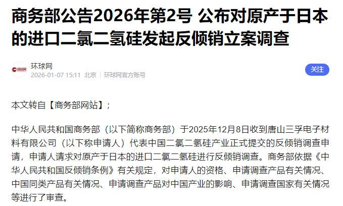 制裁日本这事越来越有意思! 就在许多人还在为日本可能动用光刻胶这张王牌而忧心忡忡时,商务部的一纸公告却悄无声息地打向了另一个看似不起眼却极为关键的领域:二氯二氢硅。 就在1月7号,商务部正式宣布对日本进口的二氯二氢硅发起反倾销调查,这招看着不起眼,实则精准戳中了日本半导体材料垄断的命门。 可能有人对“二氯二氢硅”这名字有点陌生,其实它是芯片制造的“隐形基石”,咱们用的手机、电脑,还有新能源汽车里的芯片,都离不开它。 芯片制造时得在硅片上镀一层薄膜,这层膜的质量直接决定芯片能不能用、性能好不好,而二氯二氢硅就是镀这层膜的核心材料,纯度和供应一出问题,芯片良品率就得大打折扣。 更关键的是,这东西常温下是易燃有毒的气体,生产和运输的技术门槛极高,不是随便哪个国家都能造的。 这次商务部出手调查,完全是正当防卫,有理有据。而且调查程序特别规范,倾销调查期定在2024年7月到2025年6月,产业损害调查还追溯到2022年,给足了日本企业辩解的机会。 调查会持续到2027年1月7日,特殊情况还能延长6个月,全程公开透明,让日本想抗议都找不到借口。 敢这么主动出手,核心是咱们有了底气。就说这次提交反倾销申请的唐山三孚,他们的电子级二氯二氢硅早就通过了台积电的质量验证,现在已经能规模化供货了。 还有和远气体这些企业,也在推进相关产能的试生产。 随着国产产能不断释放,2024年咱们二氯二氢硅的国产化率已经提升到40%,照这个势头,打破日本垄断只是时间问题。要是没这个硬实力,咱们也不会这么从容地发起反倾销调查。 更关键的是,1月6号商务部发布的两用物项出口管制公告,才是真正打在日本命门上的重拳。 这背后的背景是之前日本首相高市早苗发表涉台谬论,粗暴干涉咱们内政,咱们这是依法维护自身利益。 可能有人不知道,日本虽然这些年一直在找替代渠道,把整体稀土进口对华依赖度从90%降到了60%,但在镝、铽这些重稀土上,依赖度近乎100%,而这些材料正是制造电动汽车电机、导弹制导装置的关键。 日本野村综合研究所自己算过一笔账,要是咱们限制稀土出口三个月,日本相关产业就得损失6600亿日元,相当于300亿人民币。 要是限制一年,日本GDP就得缩水0.43%,损失高达2.6万亿日元。 除了稀土,咱们管制的两用物项还覆盖有机化学品、石墨等多个关键领域,每一样都能卡住日本制造业的脖子。 其实这次一系列动作最有意思的地方,就是咱们的反制完全是“以其人之道还治其人之身”,而且全程依法依规,符合国际规则。 这背后不是运气,是这些年咱们在核心技术领域默默攻关的结果,是产业链自主可控能力的持续提升,更是国家实力的直接体现。 咱们中国人从来就不怕挑战,越是被打压,越能爆发出强大的力量。 未来在更多关键领域,咱们还会继续打破垄断、掌握主动权,那些曾经想卡咱们脖子的,迟早要为自己的行为付出代价。
