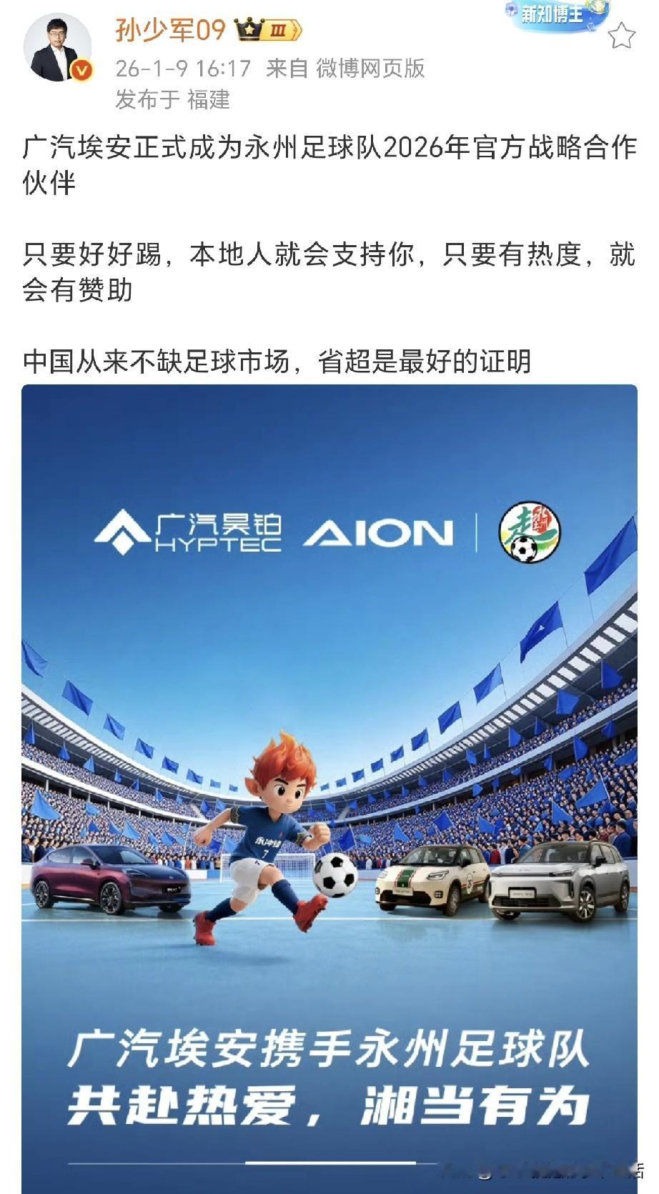 孙少军:广汽埃安正式成为永州足球队2026年官方战略合作伙伴! 2026年1月9日下午广汽埃安官宣广汽埃安正式成为永州足球队2026年官方战略合作伙伴,共同续写湘超冠军全新故事! 广汽埃安牵手永州足球队!只要有热度,就会有赞助,中国从来不缺足球市场,省超就是最好的证明! 广汽埃安表示被永州足球队草根拼搏的热血、纯粹热爱的初心与向上生长的力量所感动!广汽埃安为致敬湘超冠军直接放大招,球迷投票选出的13位永州队最佳贡献球员,每人获一台埃安UT super“永冲锋”冠军版!对球迷也诚意满满,赛事期间抽送6台埃安UT super冠军版赠予幸运球迷! 2026,为永州,为广汽埃安,加油!!