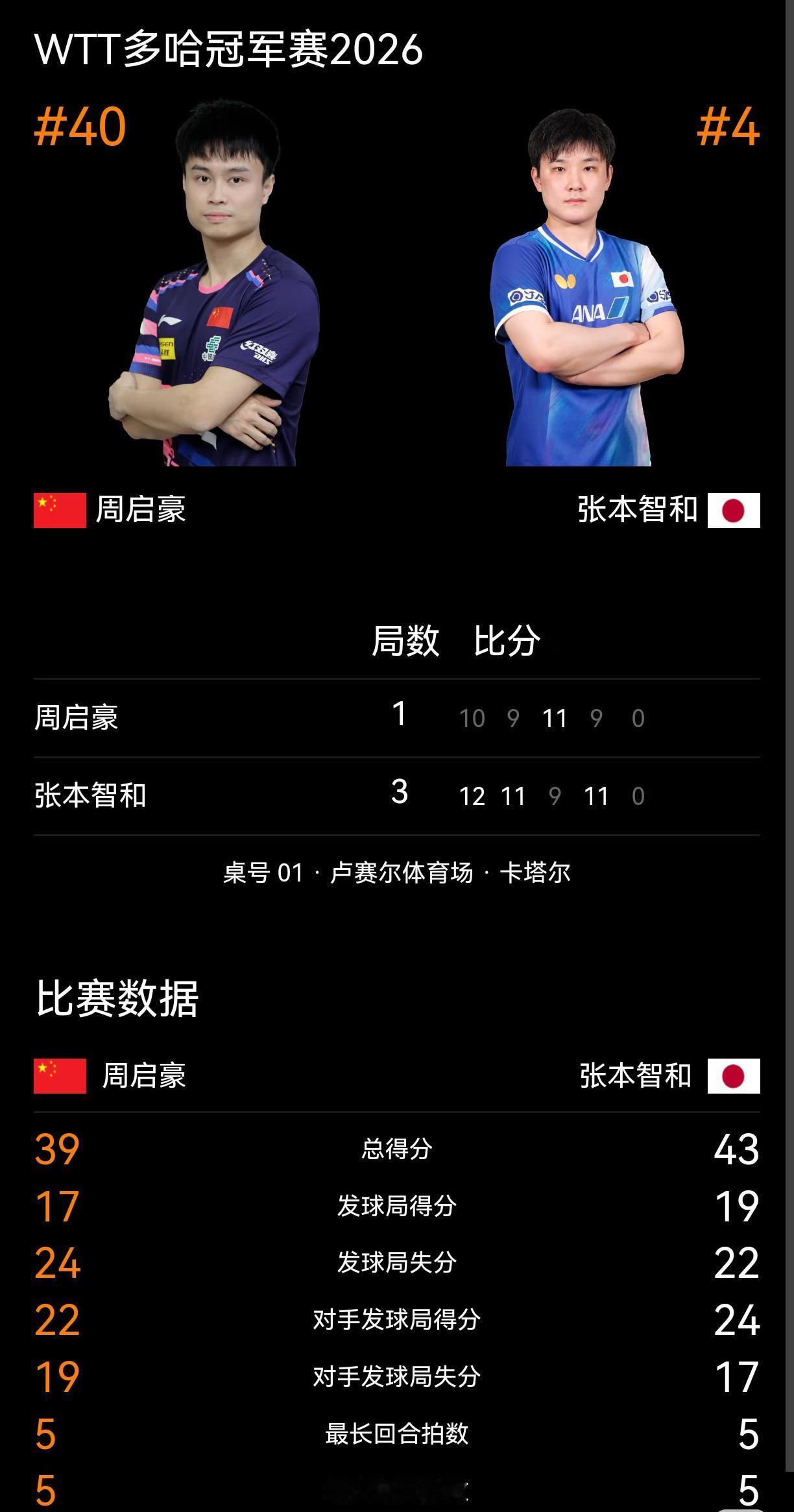 周启豪1:3不敌张本智和 比分差距很小二分惜败—虽败犹荣 10:12,9:11,11:9,9:11 周启豪今天打的很好👍, 以前从来没有看到周启豪出现在 大赛中, 更不要说直播镜头, 看来真的断层了, 不过周启豪今天打的非常热血, 球不落地,永不放弃, 每一局分差很小, 给张本智和制造了困难😓, 和向鹏昨天0:3张本看起来 有机会翻盘! 都是开局领先,局尾被追分, 特别是第一局7:2领先被逆转, 张本智和的防守也挺厉害, 好几个被防回头了! 周启豪应该以后多给机会参赛, 虽败犹荣, 打的很好👍!