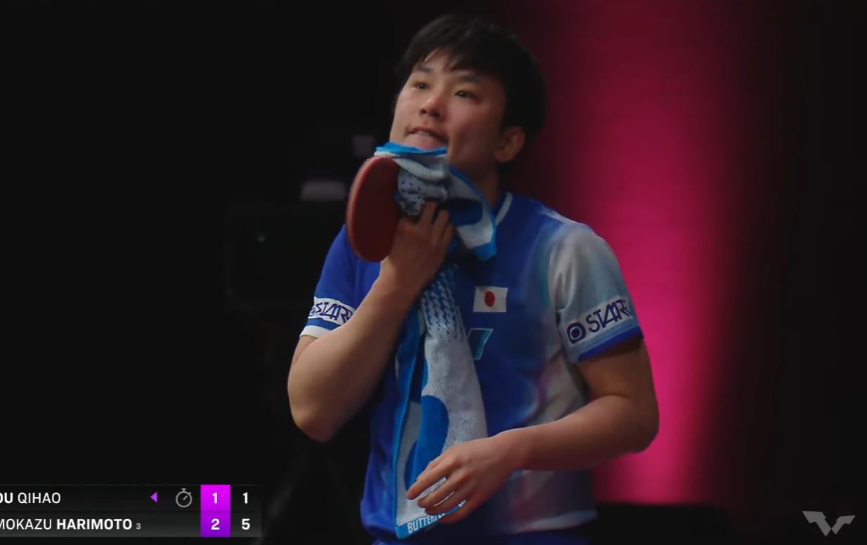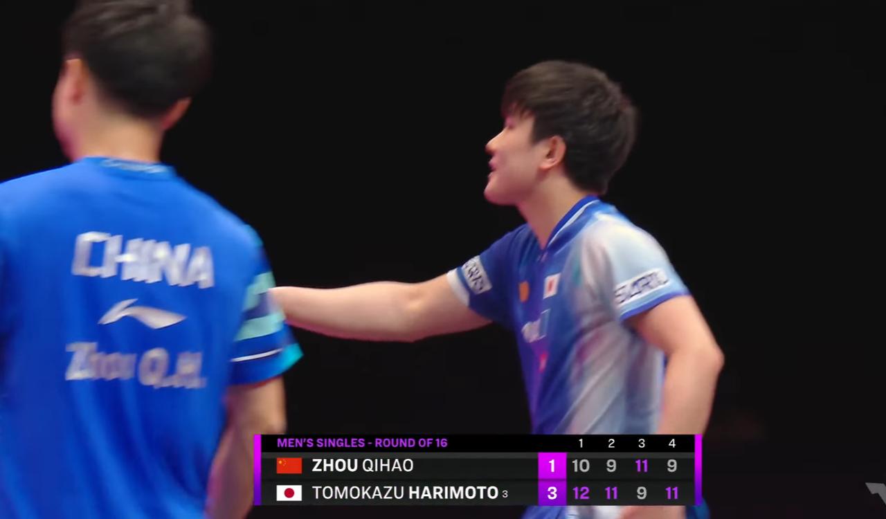 哈哈,张本智和迷之暂停! 第四局张本智和5:1领先, 居然叫了暂停! 回来之后, 周启豪一路追分, 一直追到了8:9, 张本智和没有暂停了。 可惜关键球, 周启豪没处理好, 最后还是9:11输了, 总比分张本智和3:1胜了周启豪。 但是周启豪的比分都很接近, 前两局都是大比分领先的情况下, 保守了,被张本智和逆转。 周启豪输的比较可惜。