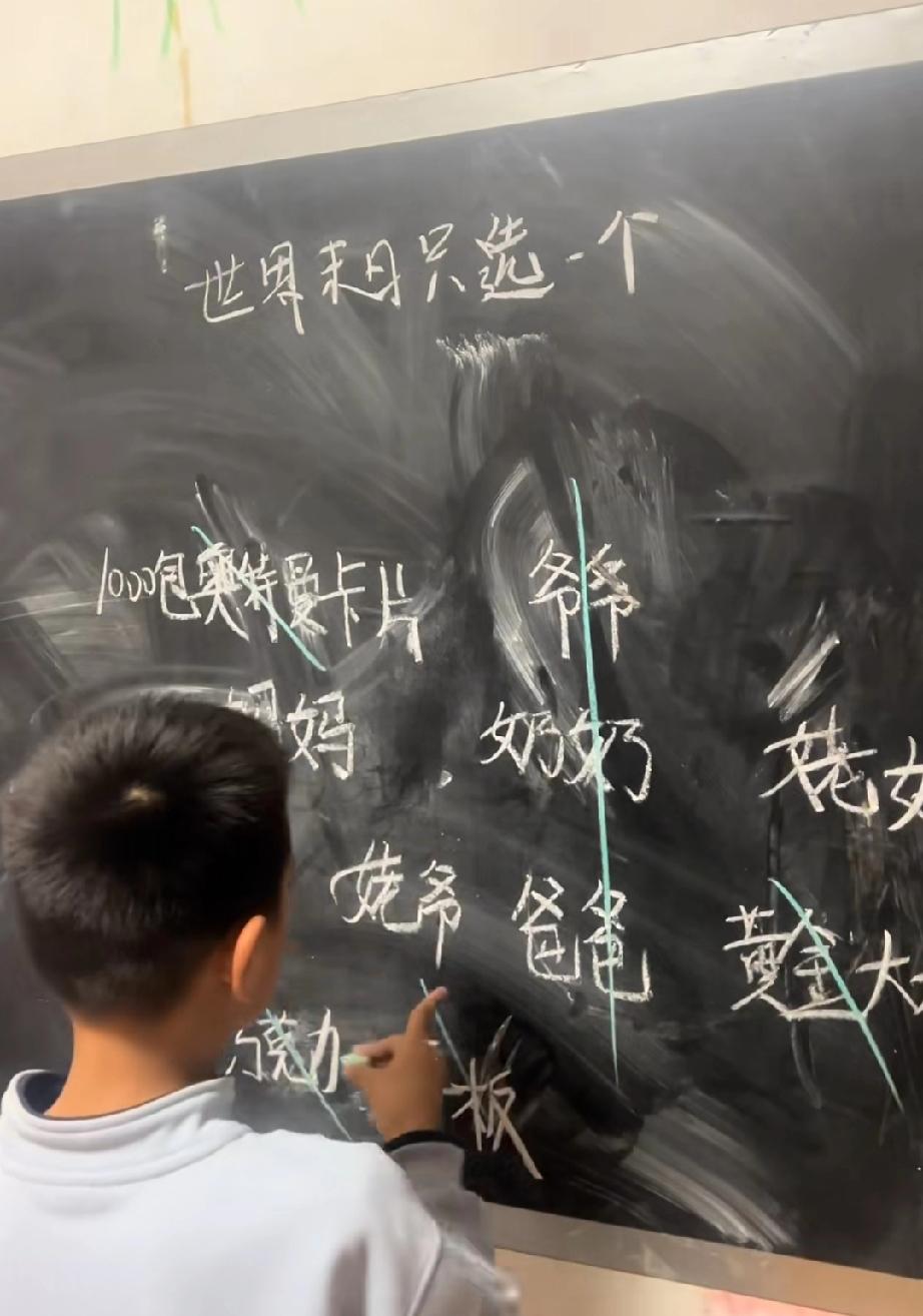 老师让小男孩做世界末日只选一个人的游戏,小男孩不假思索的直接一笔把爷爷奶奶爸爸串成了糖葫芦划掉了。 接着划掉了巧克力、平板、奥特曼卡片、黄金,然后踌躇着不再下笔,能看得出小男孩内心的挣扎。 随着时间的流逝,男孩不得不选择的时候已经泪流满面了,看着妈妈、姥爷、姥娘的选项不舍的划掉。 游戏是残酷的,希望老师以后不在再让孩子玩这种了,对于天真的孩子来说太残忍了,也可以看出孩子虽小,谁对他好他很清楚。