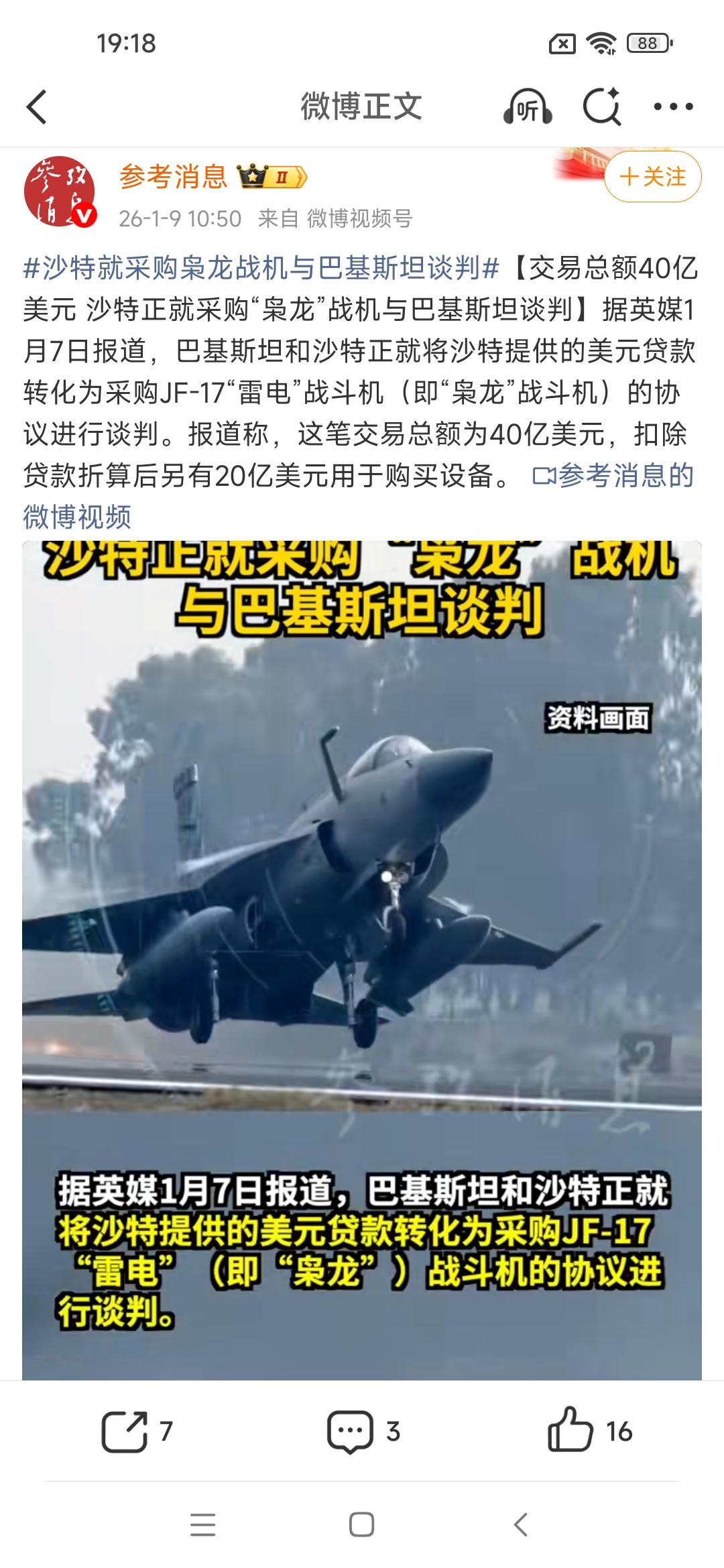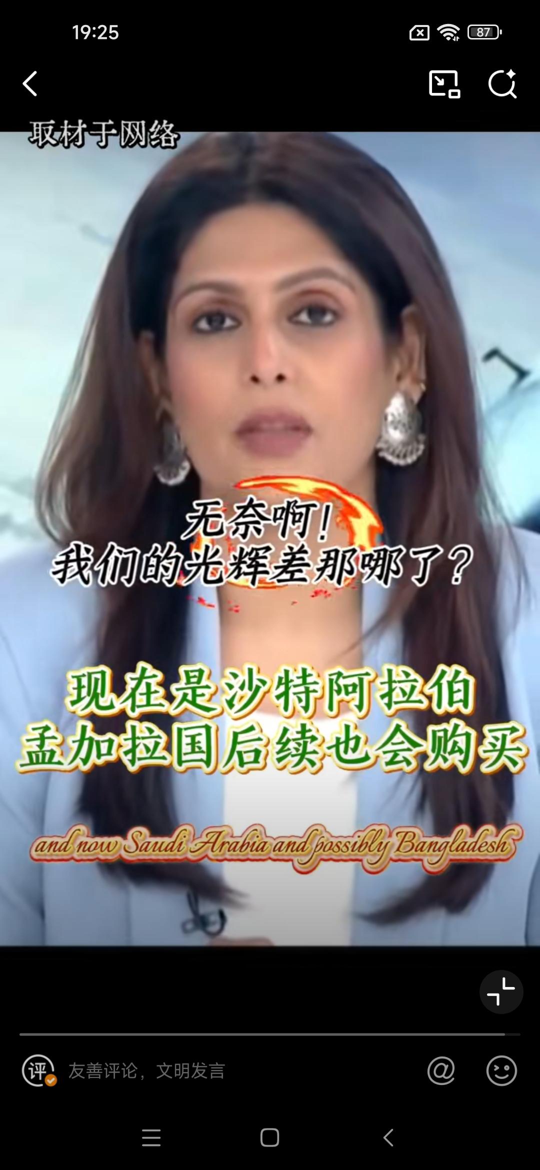 有英媒消息传出,沙特正与巴基斯坦进行谈判,沙特拟以40亿美元购买巴基斯坦JF-17雷电战斗机(即枭龙战斗机)。其中20亿美元是巴基斯坦向沙特贷款的20亿美元进行抵扣。 印度甲亢姐听说后,心里酸惨了。但她对巴基斯坦出口的飞机出口到哪里出口了多少是如数家珍,证明她的心里是羡慕嫉妒恨。 此消息如果是真的,可能带动阿联酋、埃及等国跟进采购,推动中国装备体系在中东普及,势必削弱以色列在中东的空中优势。 巴巴羊:大户,你看,阿三好怕我,他们将弹药库后撤150公里了。
